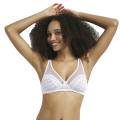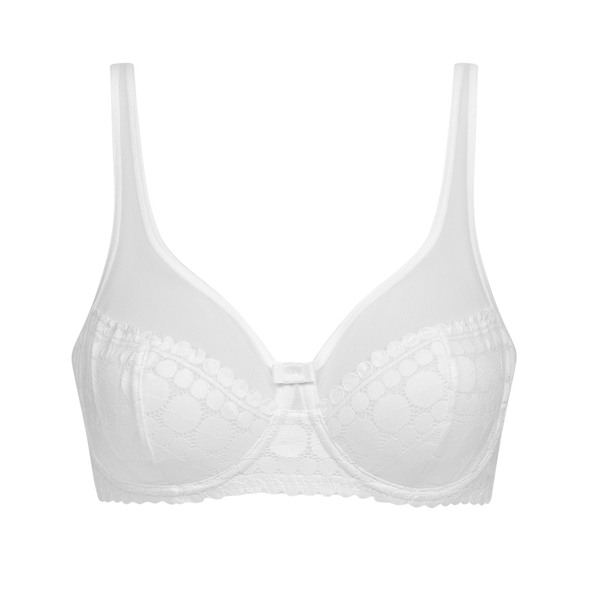 Бюстгальтер з м'якою формою чашек на кісточках з суцільнокрійними широкими бретелями. Чашки з внутрішньої сторони дубльовані тюлем, що забезпечує бездоганну підтримку. Бічна панель у великих розмірах підсилена м'якою кісткою. Овальна спинка зменшує навантаження на хребет.Чашки бюстгальтера виконані з мережива в горошек.