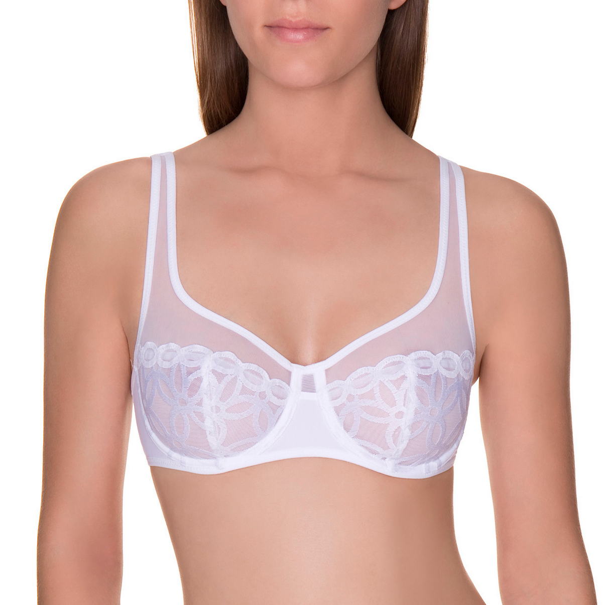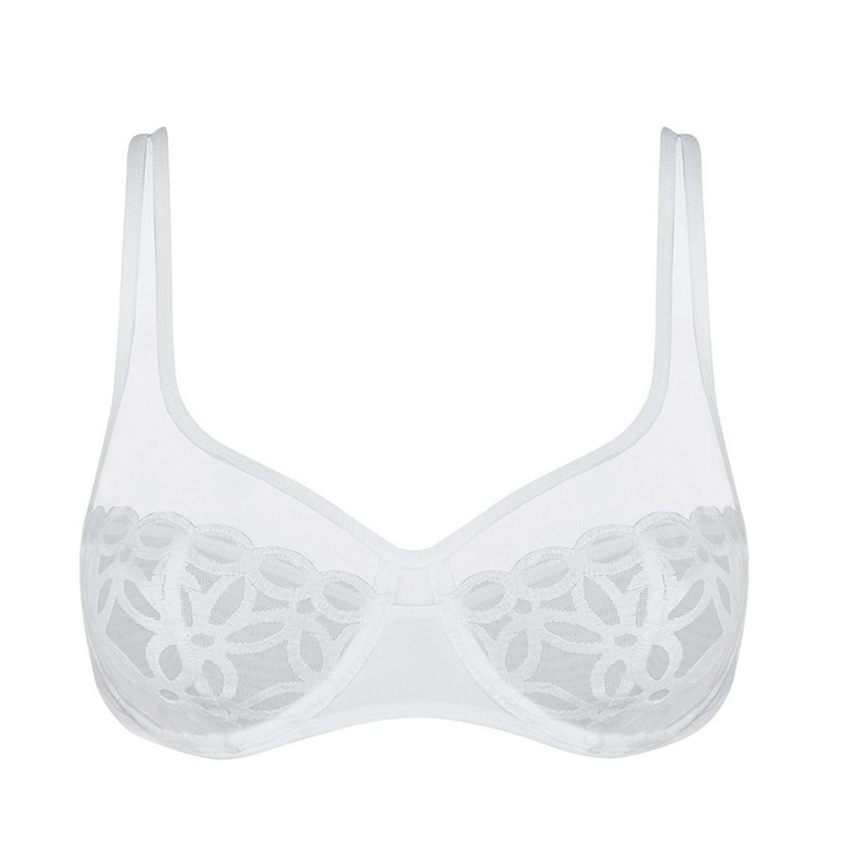 Бюстгальтер класичний з м’якою формою чашок на кісточках, з суцільнокрійними широкими бретелями та дубльованими з внутрішньої сторони чашками забезпечить бездоганну підтримку. Бічні панелі посилені м'якими кісточками. Овальна спинка зменшує навантаження на хребет. Вертикальний шов на чашці трохи округлює форму грудей . Вишивка по тюлю надає виробу жіночного вигляду.