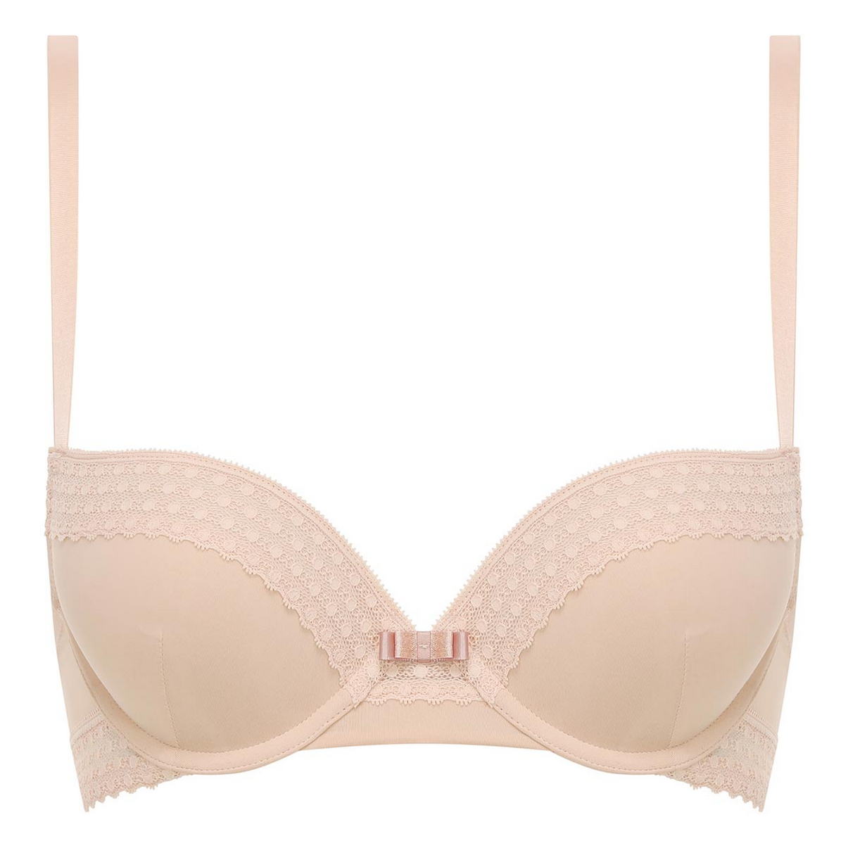 Бюстгальтер пуш ап з товстим шаром мусу (для надання візуально додаткового обсягу). Верхній край чашок декорований мереживною тасьмою. На центральній панелі розмістився бант із вкрапленнями люрексу. Регульовані бретелі. Нижній край бічних панелей також декорований мереживом. Виготовлений з м'якої мікрофібри, бюстгальтер забезпечить комфорт протягом усього дня і мега-сексуальне декольте.