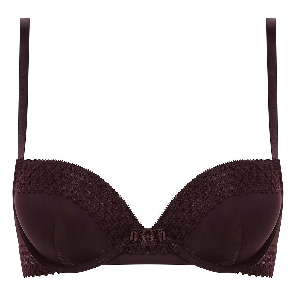 Бюстгальтер пуш ап з товстим шаром мусу (для надання візуально додаткового обсягу). Верхній край чашок декорований мереживною тасьмою. На центральній панелі розмістився бант із вкрапленнями люрексу. Регульовані бретелі. Нижній край бічних панелей також декорований мереживом. Виготовлений з м'якої мікрофібри, бюстгальтер забезпечить комфорт протягом усього дня і мега-сексуальне декольте.