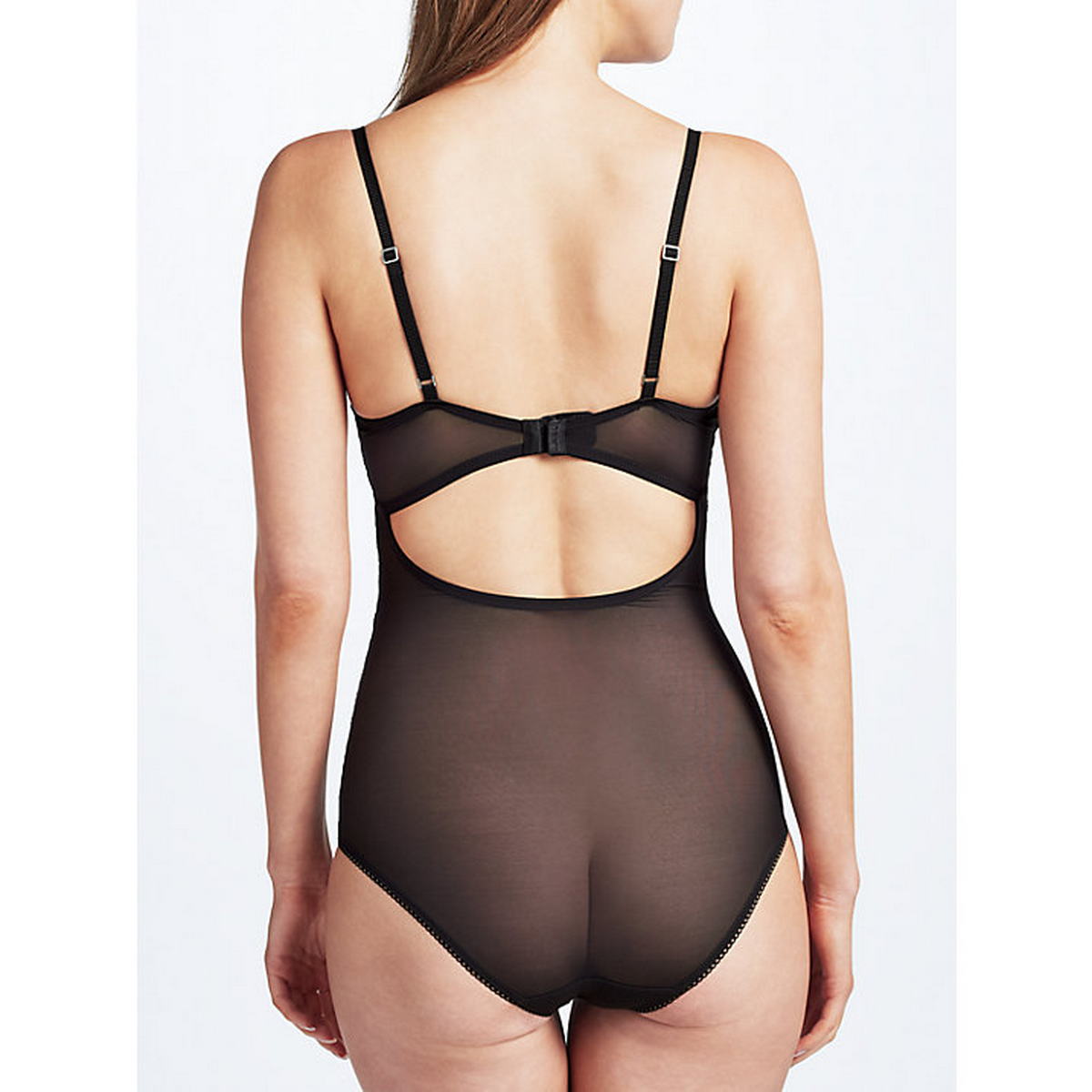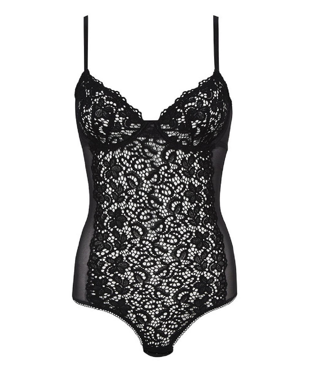 Боді з м'якою формою чашок, на кісточках, з 3 вертикальними швами. Чашки повністю виготовлені з гірюру із квітковим орнаментом. Задня панель виготовлена з напівпрозорого тюлю, з вирізом. На застібці, як у бюстгальтера. Основна застібка – між ніг – на гачках.