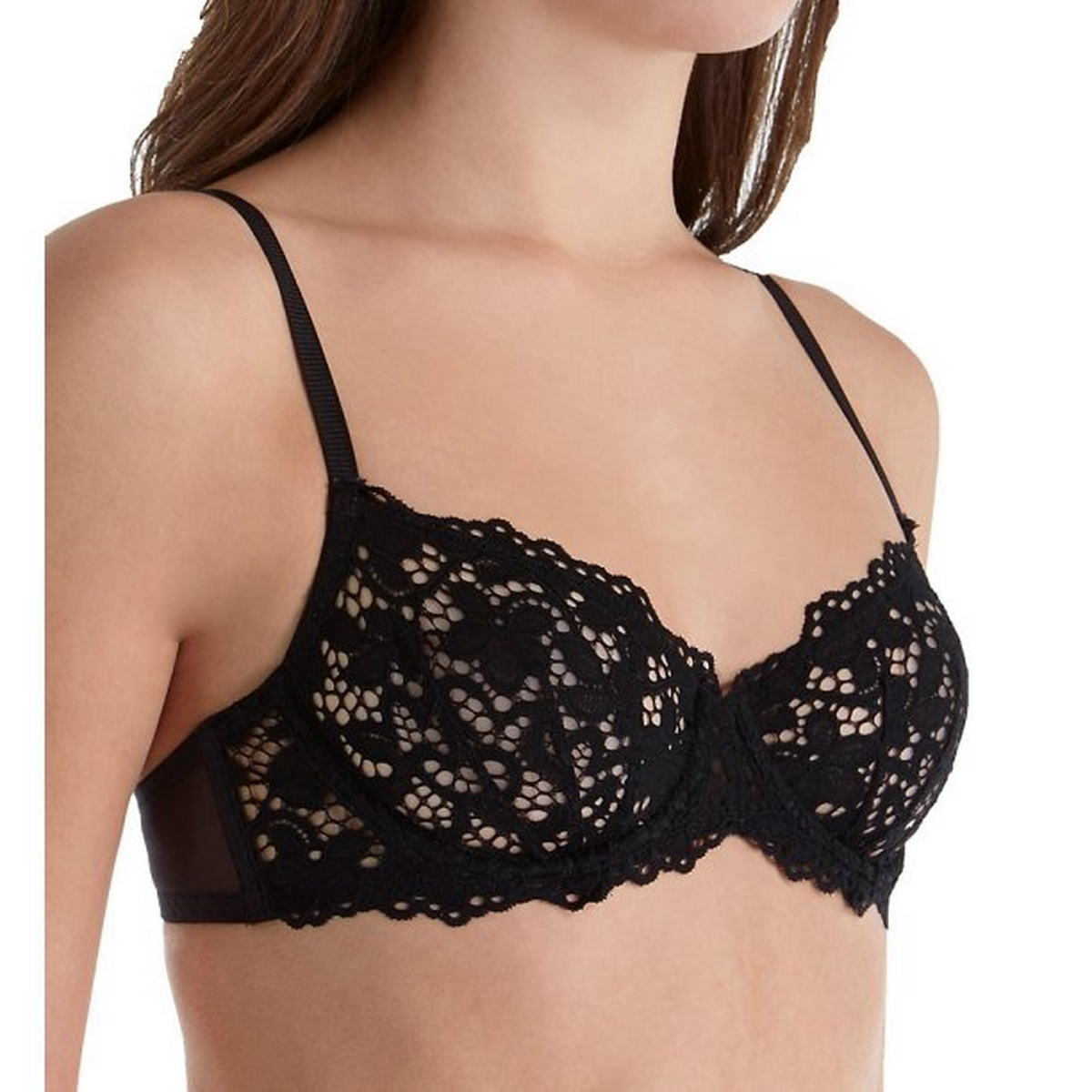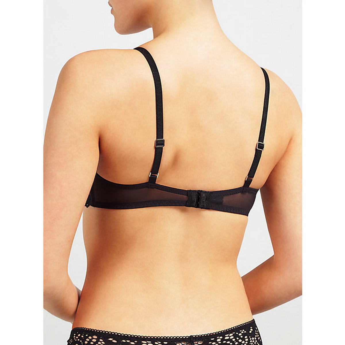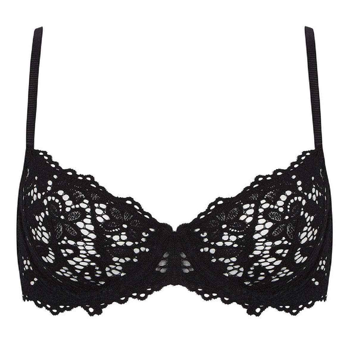 Бюстгальтер з м'якою формою чашок, на кісточках, з 3 вертикальними швами. Чашки повністю виготовлені з гіпюру з квітковим орнаментом. Бічні панелі "оснащені" кісточками - для додаткової підтримки. Задні панелі виготовлені з напівпрозорого тюлю. Регульовані бретелі з логотипом.