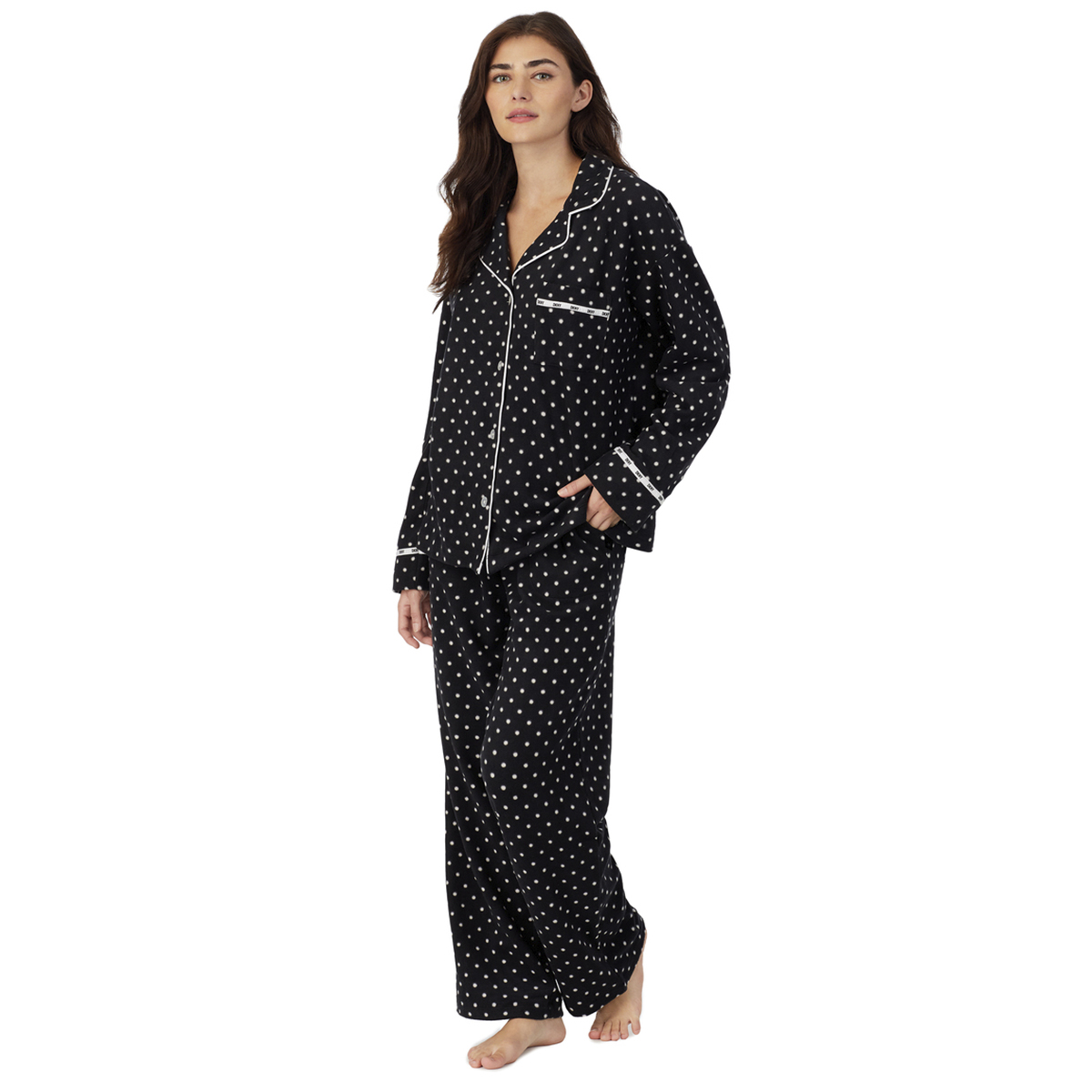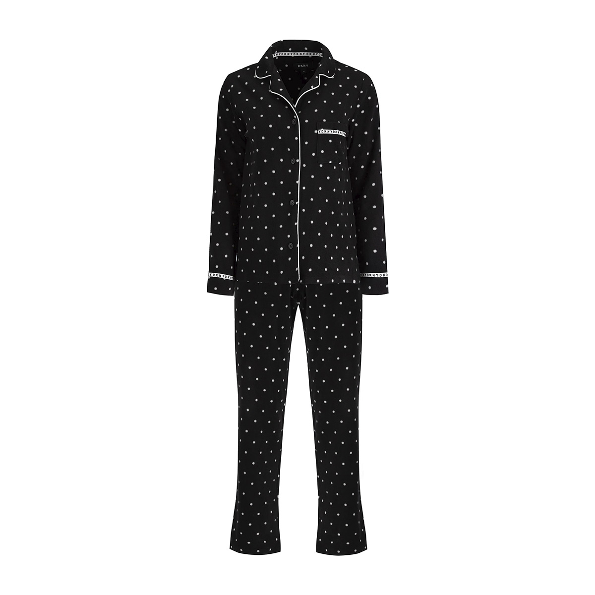 Класична піжама виготовлена з м'якого пухнастого флісу. Жакет вільного крою в чоловічому стилі, на ґудзиках, з довгими рукавами, коміром та нагрудною кишенею. Штани вільного класичного крою, з кишенями, пояс на гумці з логотипом.