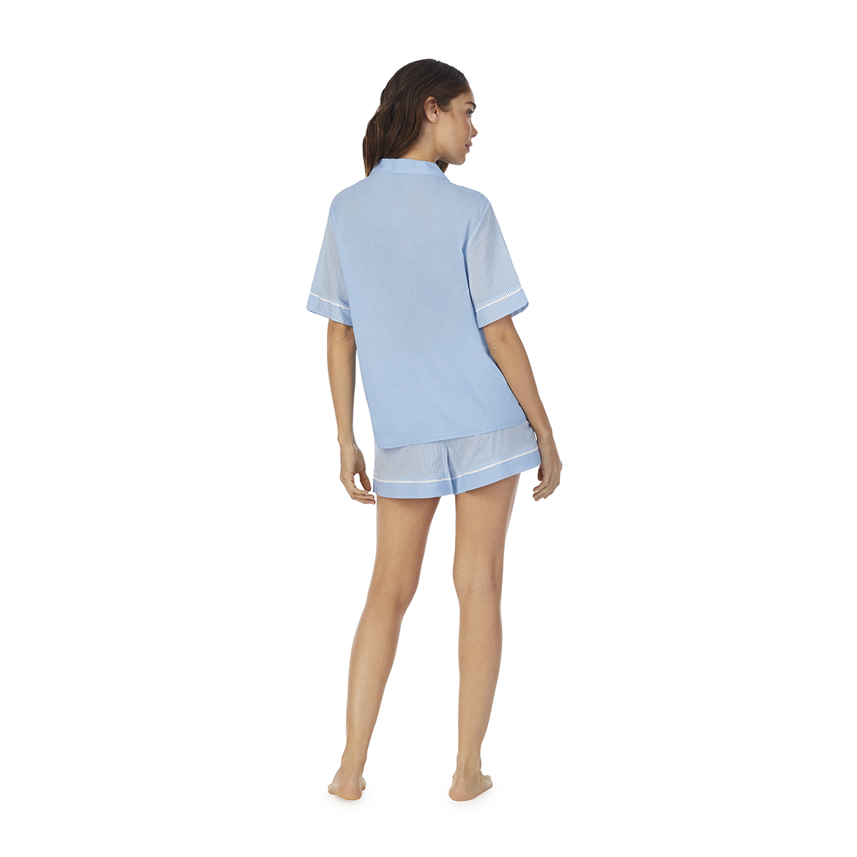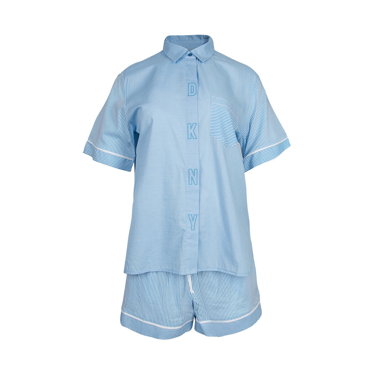 Піжама: сорочка + шорти. Сорочка - у чоловічому стилі, вільного крою на ґудзиках, із короткими рукавами, із нагрудною кишенею. Шорти – вільного крою, з бічними кишенями, пояс на резинці.