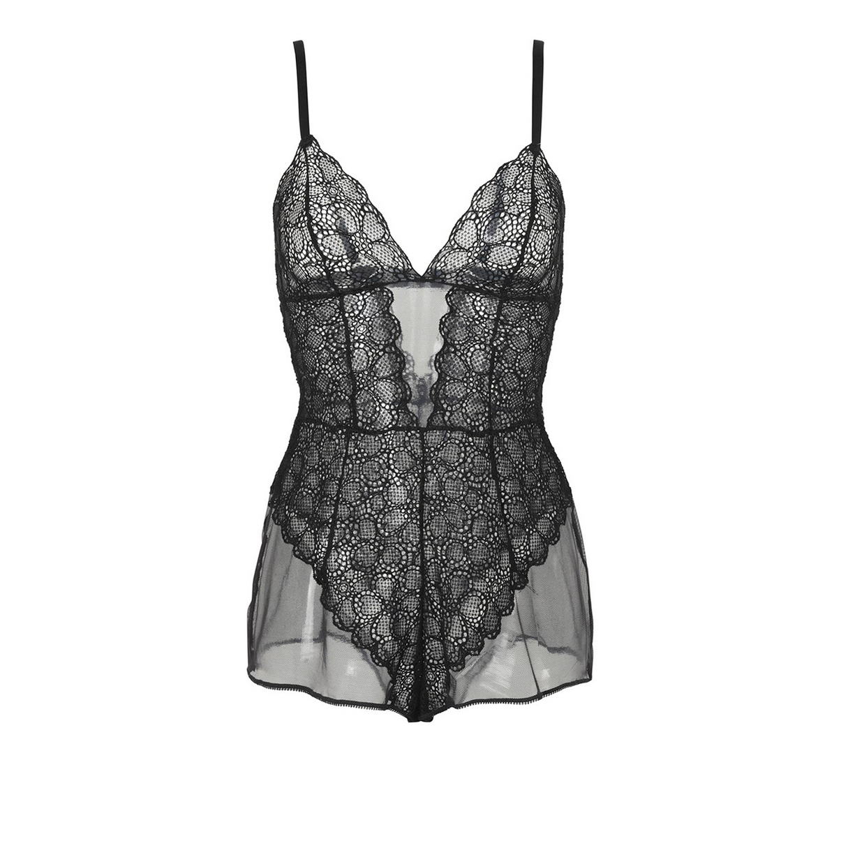 Боді зі злегка ущільненою трикутною формою чашок без кісточок. Майже повністю виготовлено з мережива. Декороване вставками із прозорого тюлю. Регульовані бретелі.