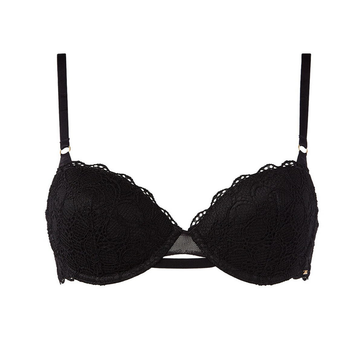 Бюстгальтер - балконет із ущільненою за допомогою невеликого шару мусу формою чашок. Чашки вкриті мереживом. Бічні та задня панелі з мережива. Регульовані бретелі. На одній із бічних панелей металева деталь із логотипом.