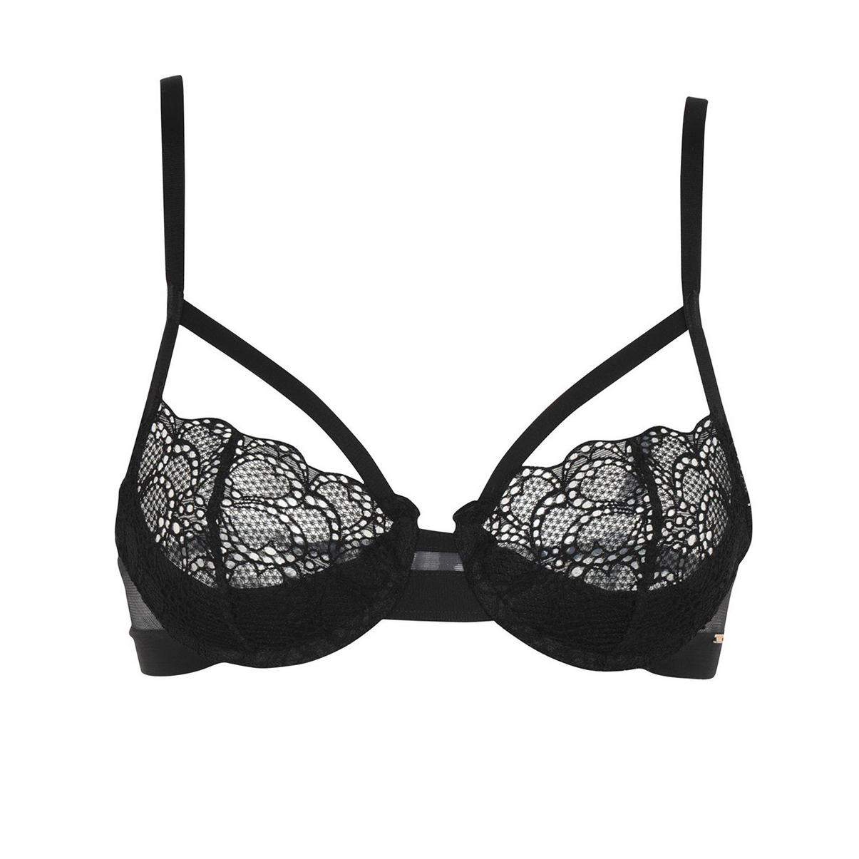 Бюстгальтер з м'якою формою чашок виконаних з мережива, на кісточках. Нижня частина чашок трохи ущільнена. Область декольте оснащена графічними (незйомними) смужками, щоб ще більше підкреслити Ваші груди. Бічні та задня панель виконані з тюлю. На одній із бічних панелей металева деталь із логотипом. Регульовані бретелі.