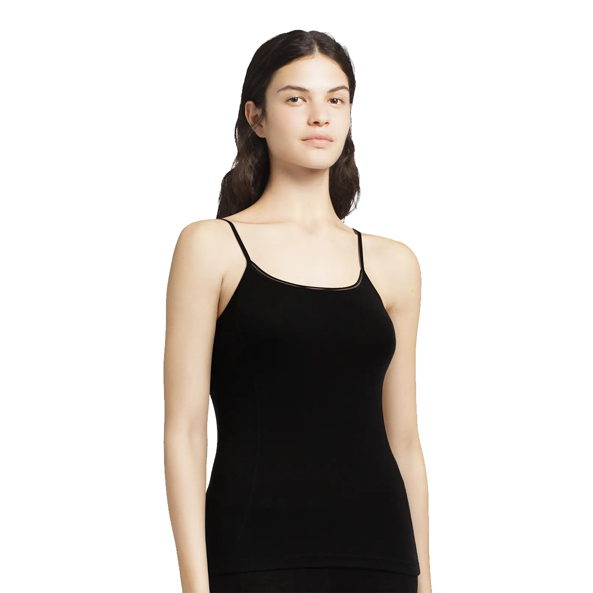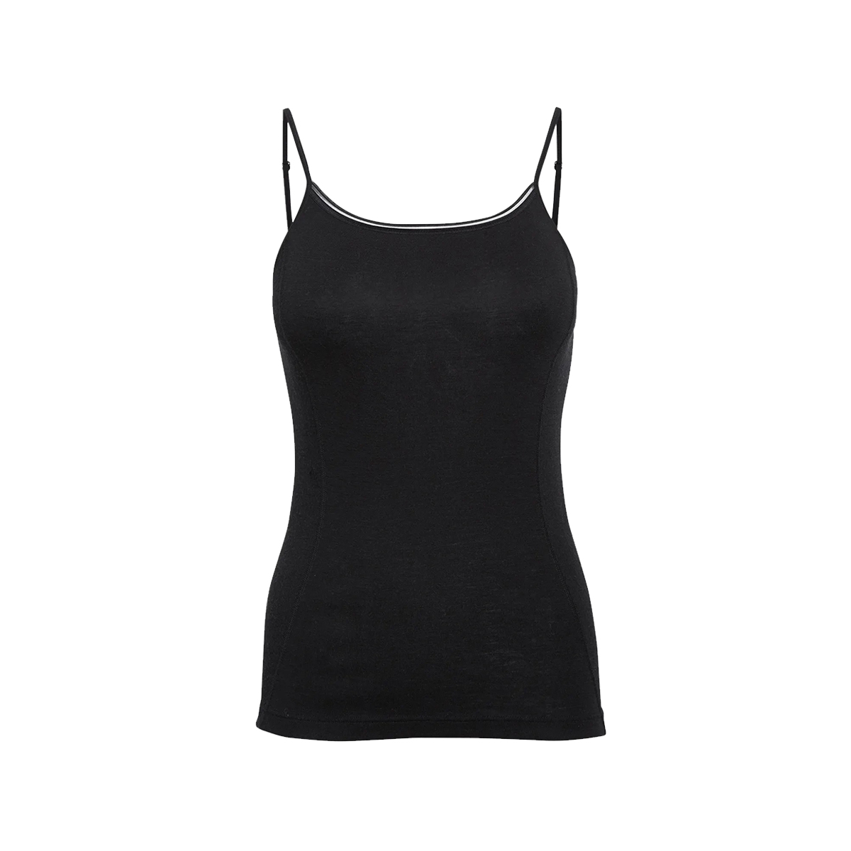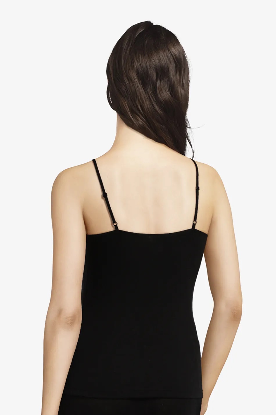 Майка на тонких бретельках, що регулюються. Виконана з вовни та шовку з використанням двох різних видів трикотажу для максимального облягання (з метою досягнення максимального комфорту) та мінімального "ковзання" по тілу.