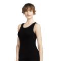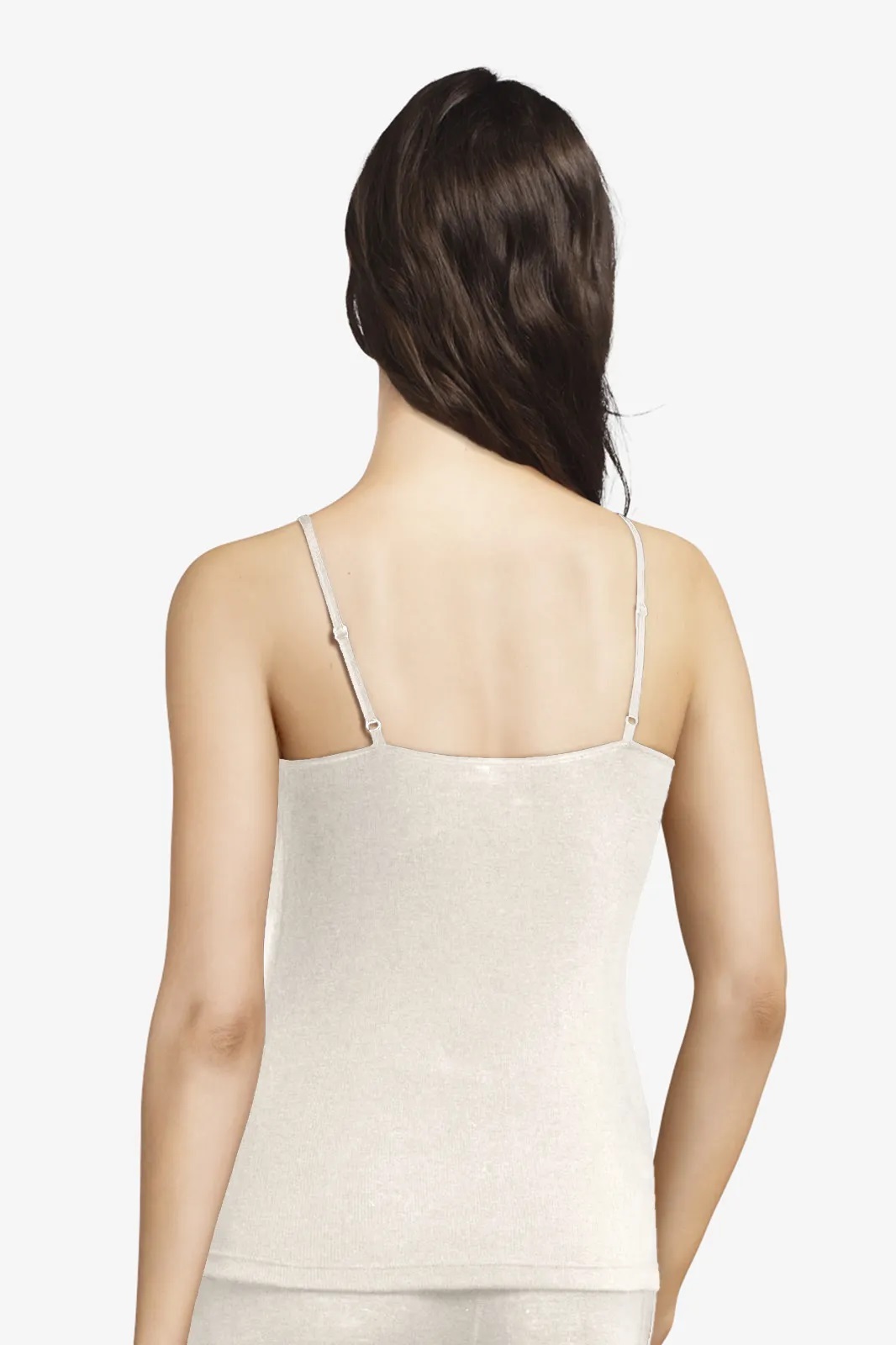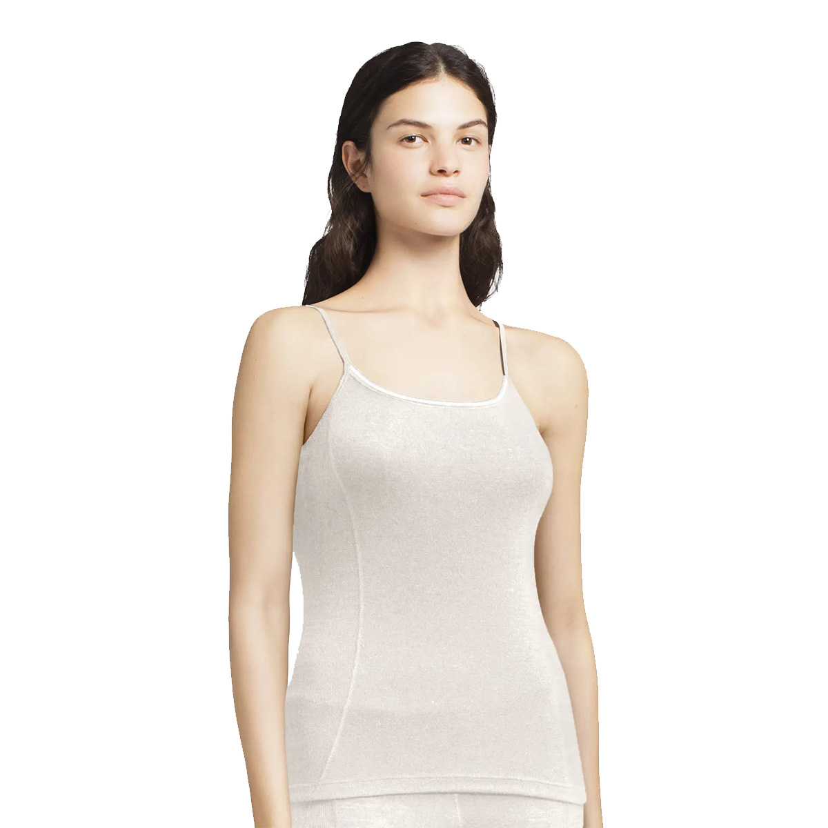 Майка на тонких бретельках, що регулюються. Виконана з вовни та шовку з використанням двох різних видів трикотажу для максимального облягання (з метою досягнення максимального комфорту) та мінімального "ковзання" по тілу.
