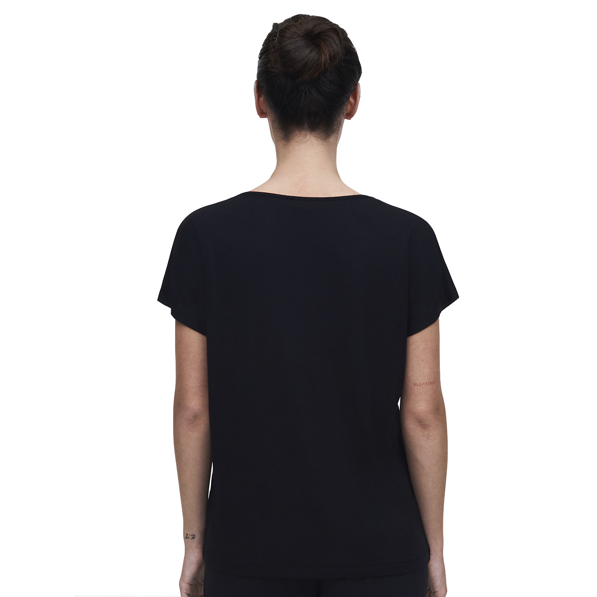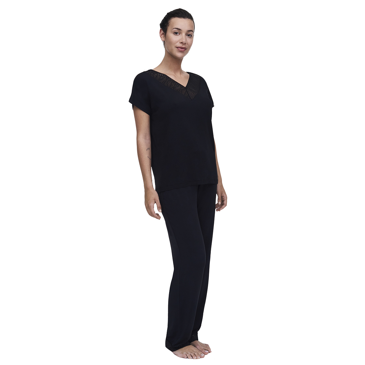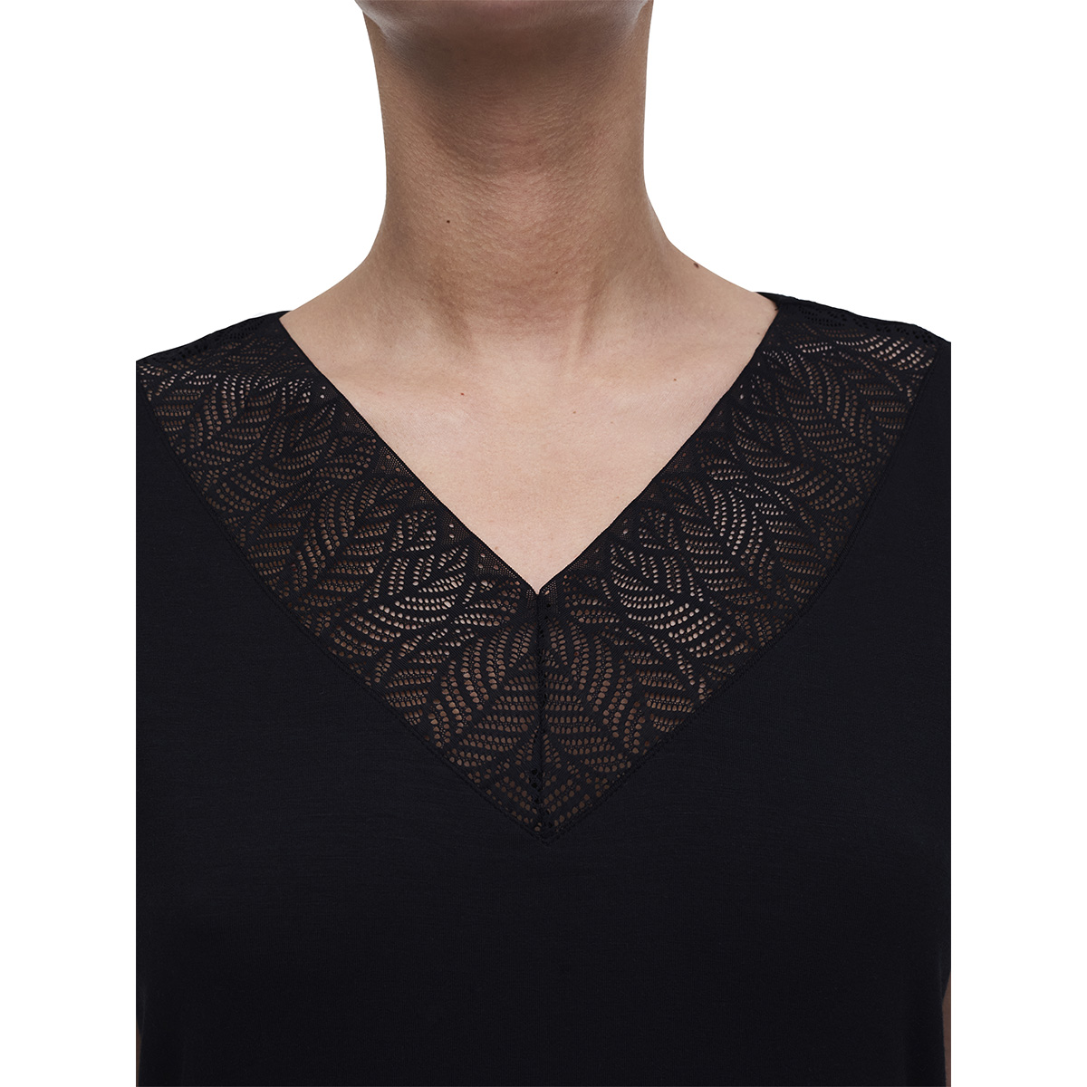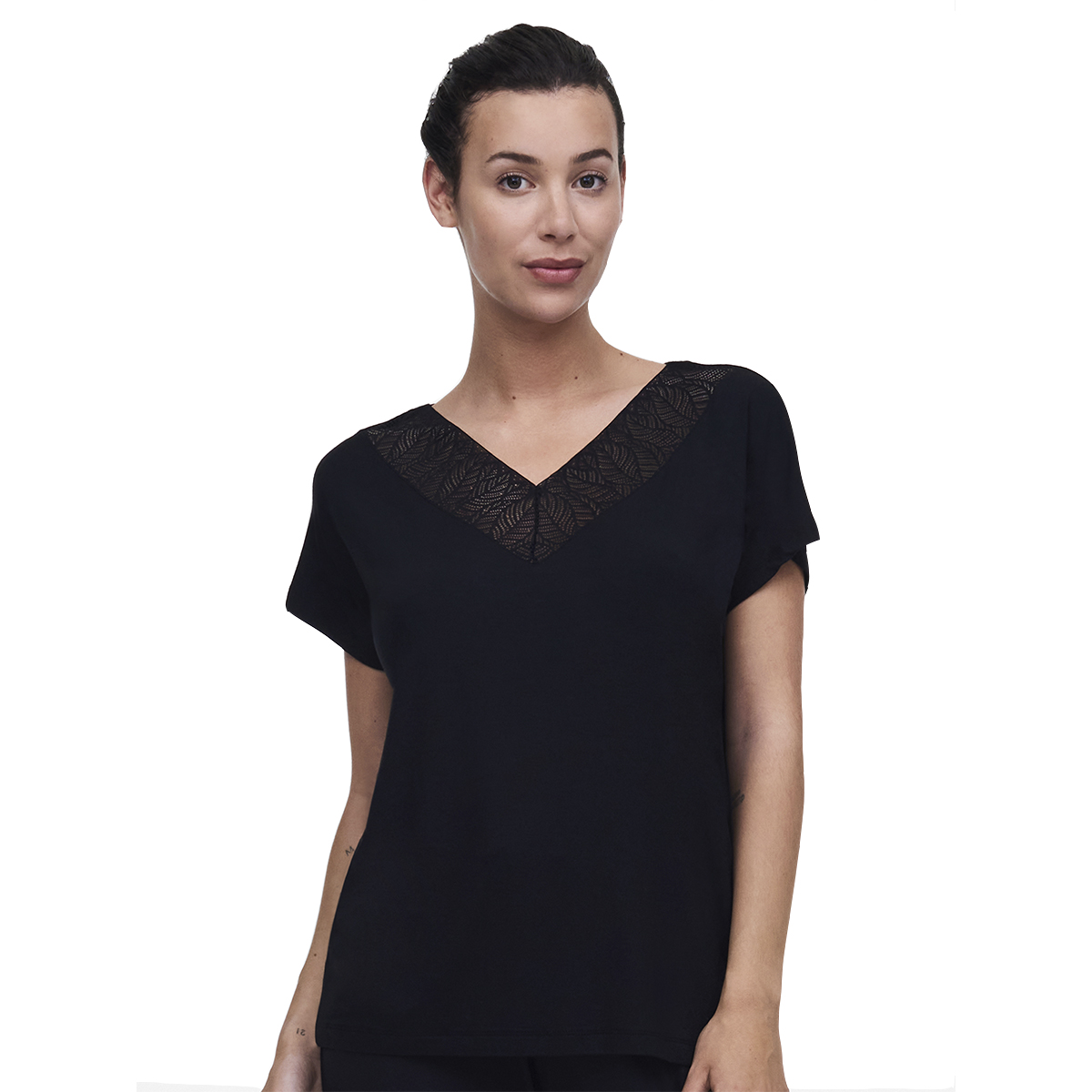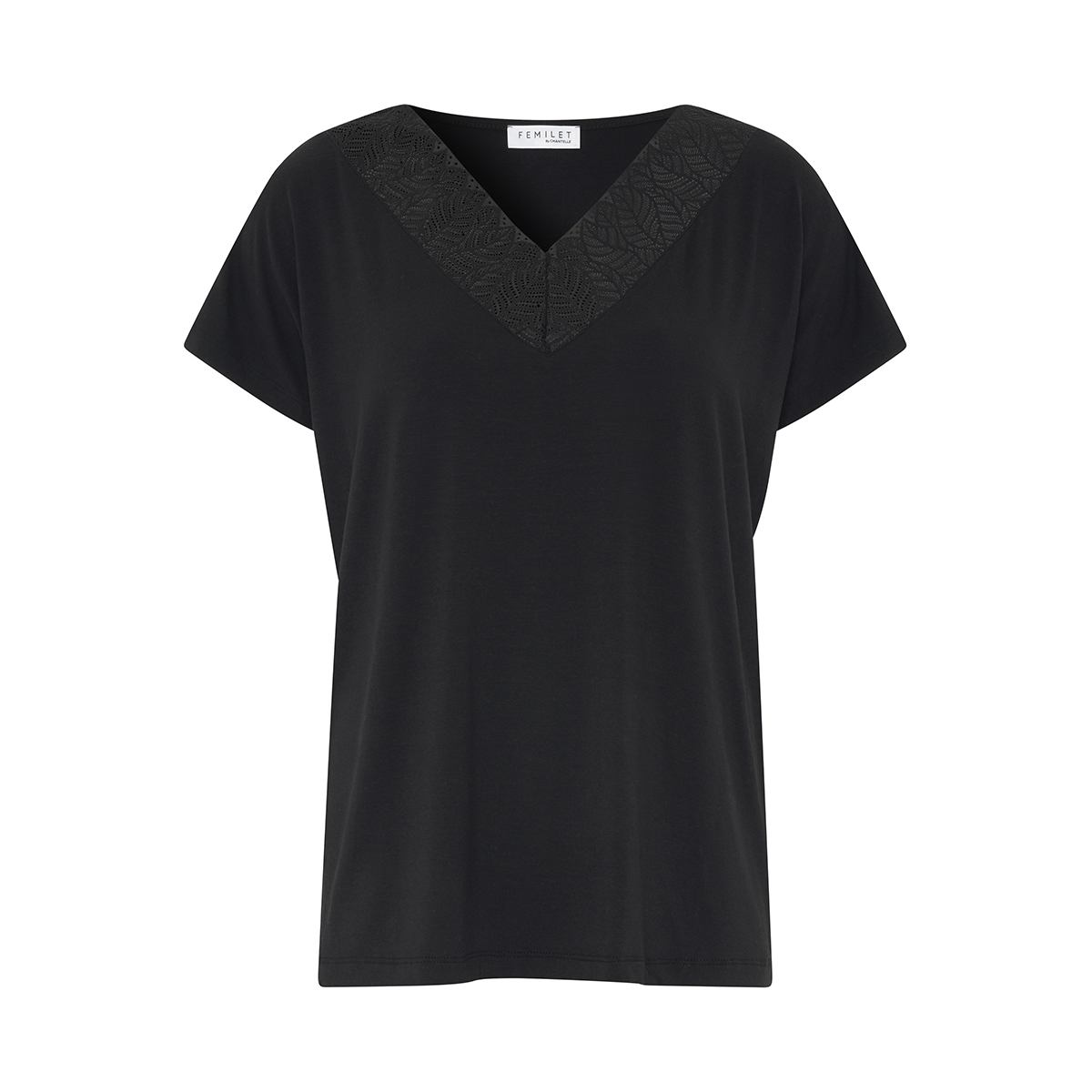 Футболка вільного крою з V-подібним вирізом із короткими рукавами. Область декольте декорована мереживом. Виконана з м'якого модалю.