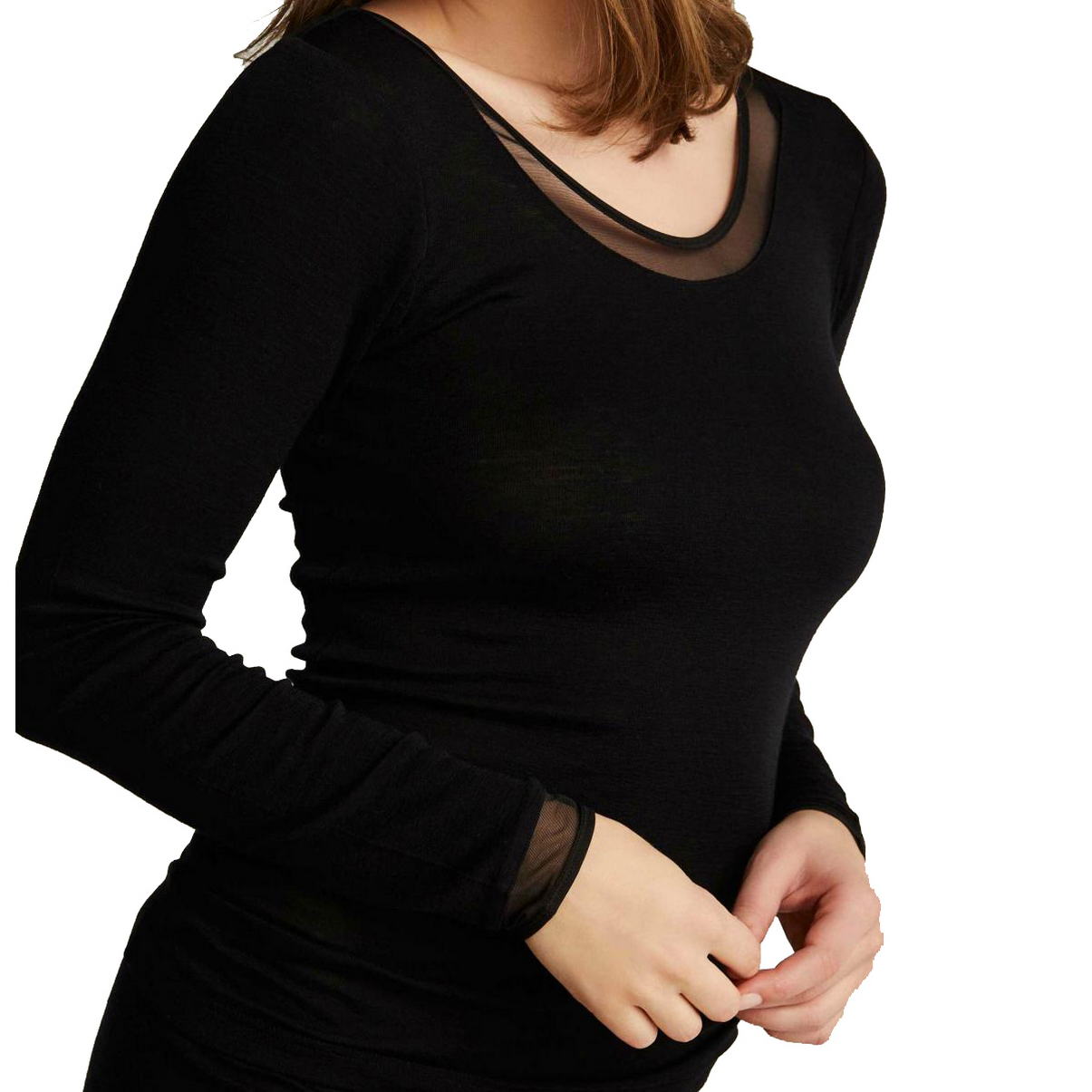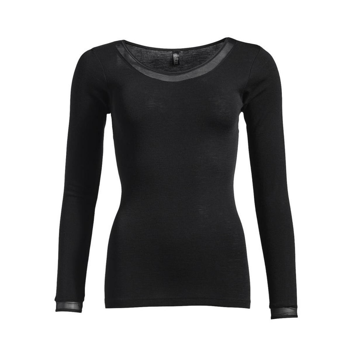 Футболка з довгими рукавами. Верхній край передньої панелі декорований невеликою вставкою із тюлю.