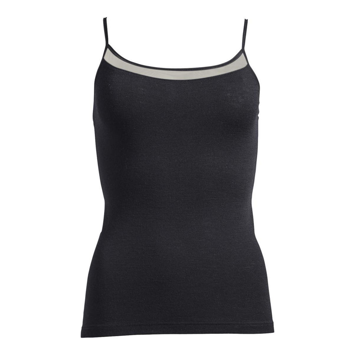 Майка на тонких бретелях, що регулюються. Верхній край передньої панелі декорований невеликою вставкою із тюлю.