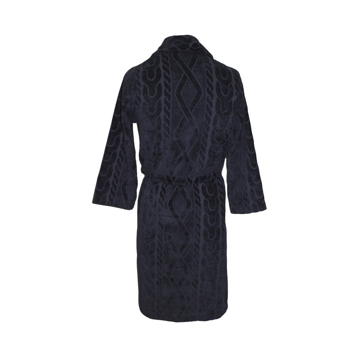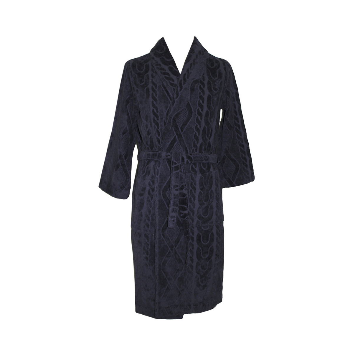 Класичний халат із запахом та глибокими бічними кишенями виготовлений з махрової тканини з рельєфним малюнком у вигляді «в'язаних кіс». Відкладний комір, знімний пояс.