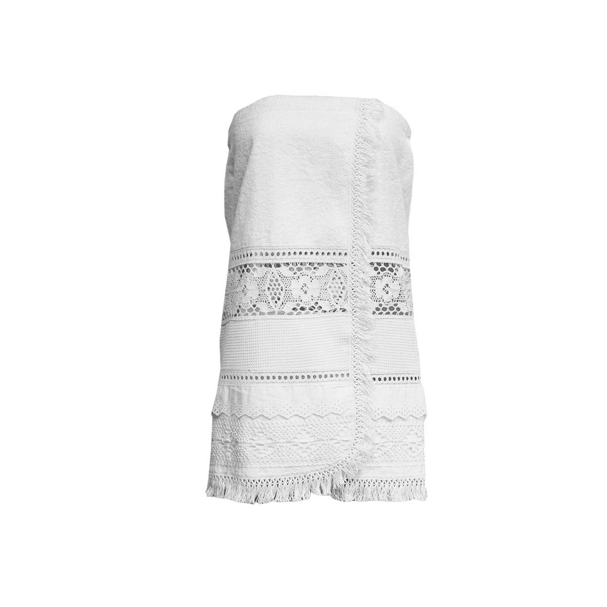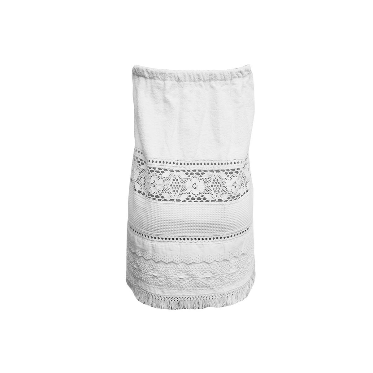 Розкішне махрове парео, застібається липучкою. По спинці м'які волани завдяки вставленій резинці. Ціліснокроєне махрове полотно. Делікатне оформлення з розкішного мережива, вставок вафельного матеріалу та прошви роблять цей виріб витвором мистецтва!