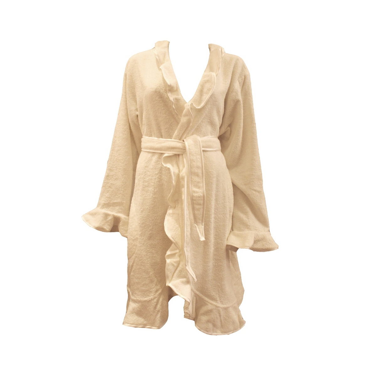 Махровий халат з довгим рукавом. Витончена окантовка по всіх краях виробу з гладкого атласу у вигляді великого жабо, потайні кишені, знімний пояс підкреслює силует.