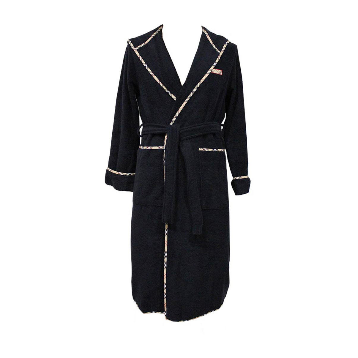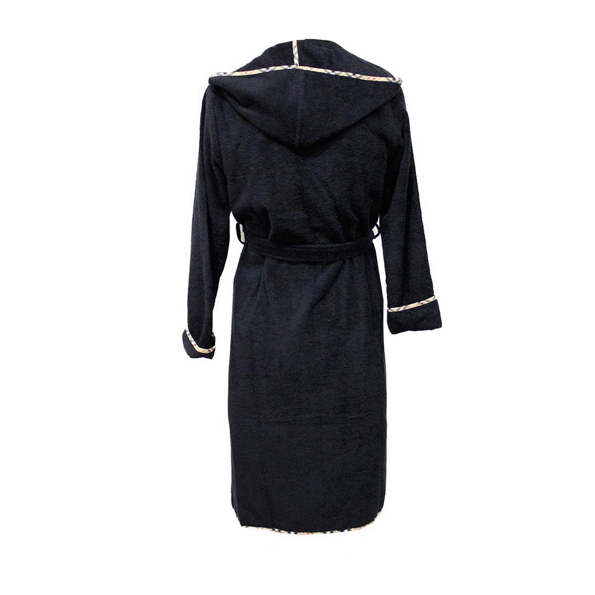 Махровий халат з капюшоном. Ціліснокроєне махрове полотно, вшитий рукав. Накладні кишені, знімний пояс для комфорту. Виріб декорований контрастною тасьмою (у клітину).