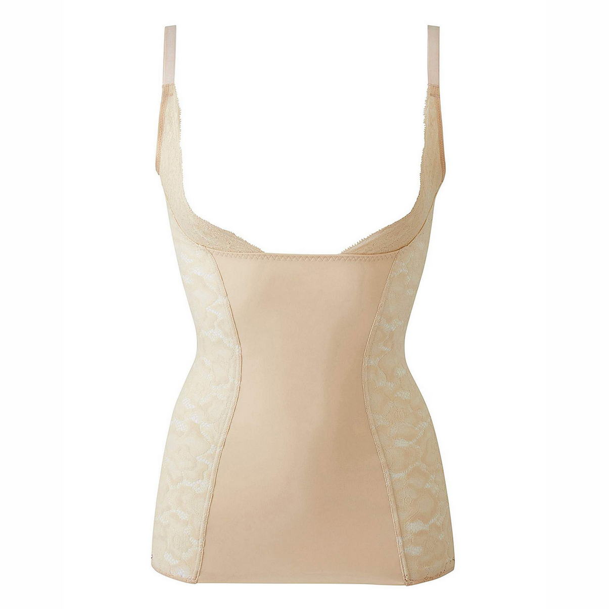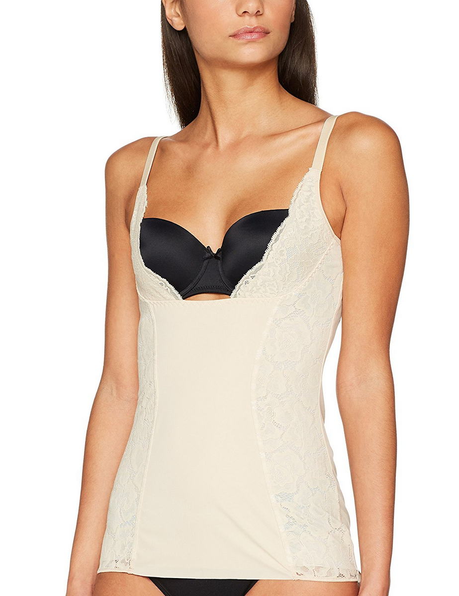 Безшовний топ, що не електризується, виготовлений з "невагомого" матеріалу, який візуально відкоригує Ваш торс. Відкрита ділянка грудей дозволяє носити ваш бюстгальтер. Мереживні вставки в області пахв, дубльовані тюлем, відкоригують проблемні ділянки. Передня панель, повністю дубльована тюлем, з плоскими швами зробить Ваш живіт плоскішим. Задня панель зі швами – щоб покращити "прилягання". Регульовані бретелі. Плоске оздоблення нижнього краю. Округла спинка.