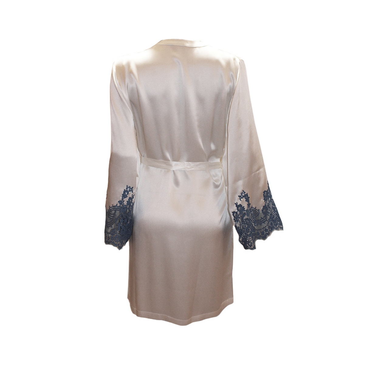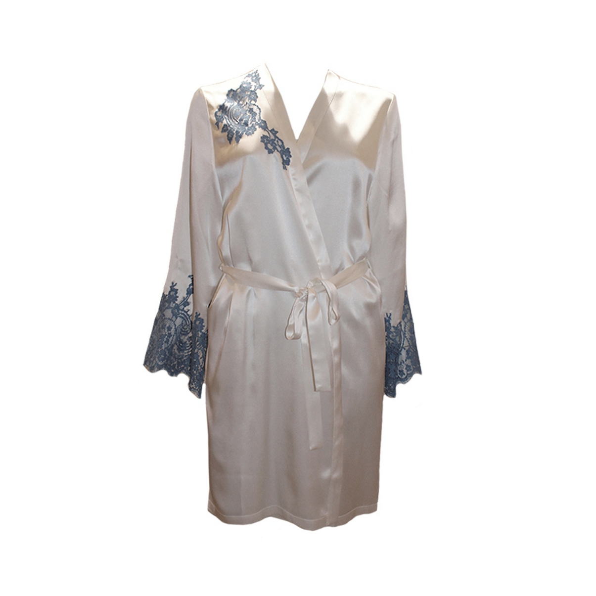 Короткий халат з атласного шовку, декорований розкішною мереживною аплікацією. Рукав інкрустований квітковим мереживом. Модель фіксується зсередини на зав'язку та зовні на вузький пояс. Кишені-невидимки у бокових швах. Виріб виконаний з найніжнішого шовку та кращого мережива "Кале".