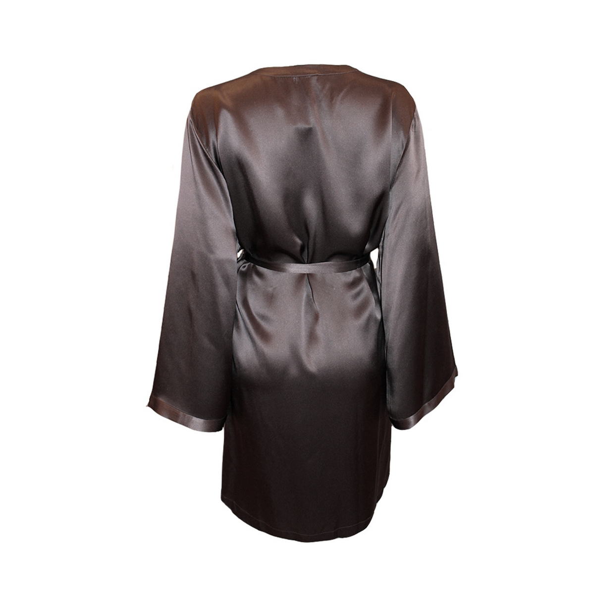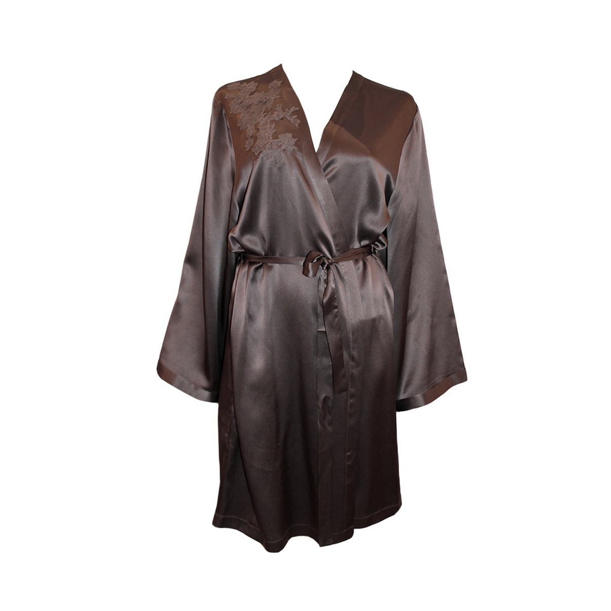 Короткий халат з атласного шовку, декорований розкішною мереживною аплікацією. Модель фіксується зсередини на зав'язку та зовні на вузький пояс. Кишені-невидимки у бічних швах.