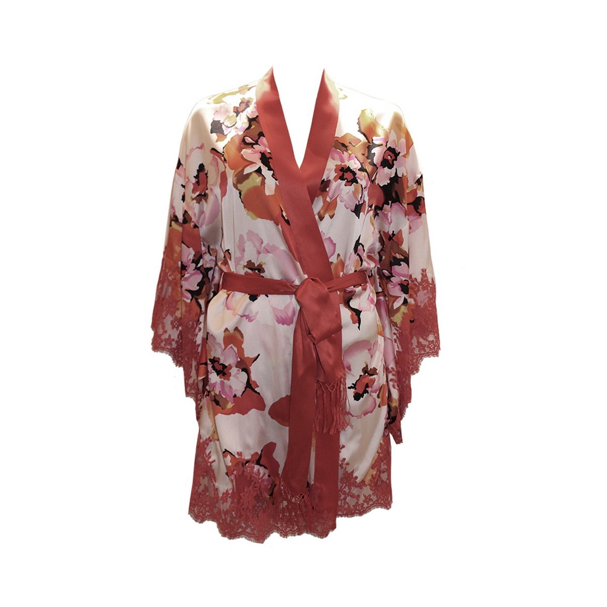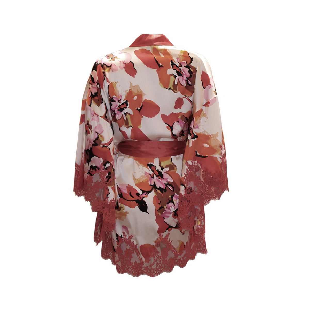 Шовковий халат фіксується на зав'язку зсередини і вузьким поясом зовні. Елегантний рукав та лінія низу інкрустовані розкішним мереживом, що надає образу спокусливості. Лінія горловини оброблена вузьким кантом, що формує лаконічний образ. Квіткові мотиви, нанесені на тканину, виконані у техніці "батік". Вишуканий варіант для дому та відпочинку.
