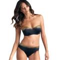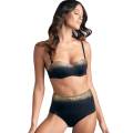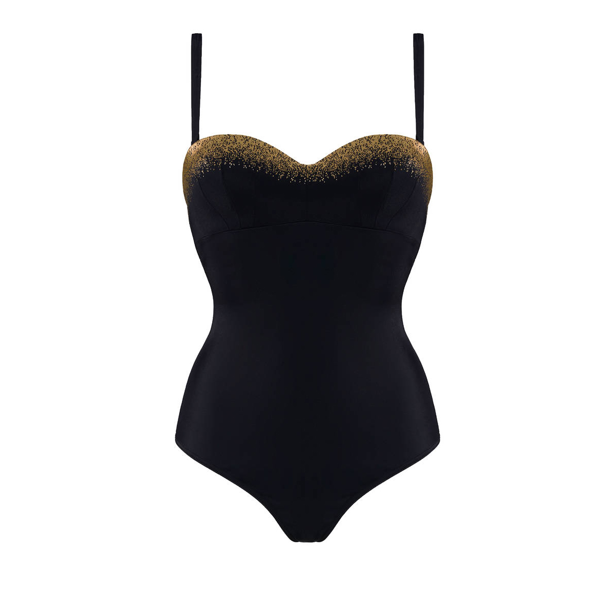 Цільний купальник з ущільненою формою чашок на кісточках. Чашки покриті мікрофіброю, яка швидко сохне, а золоте напилення має захист від пляжного впливу. На чашках - три шви із зубчастими краями, які додають витонченості та стилю. Регулюючі бретелі відстібаються. Передня панель повністю дубльована для уникнення прозорості. Задня панель в області сідниць досить відкрита.