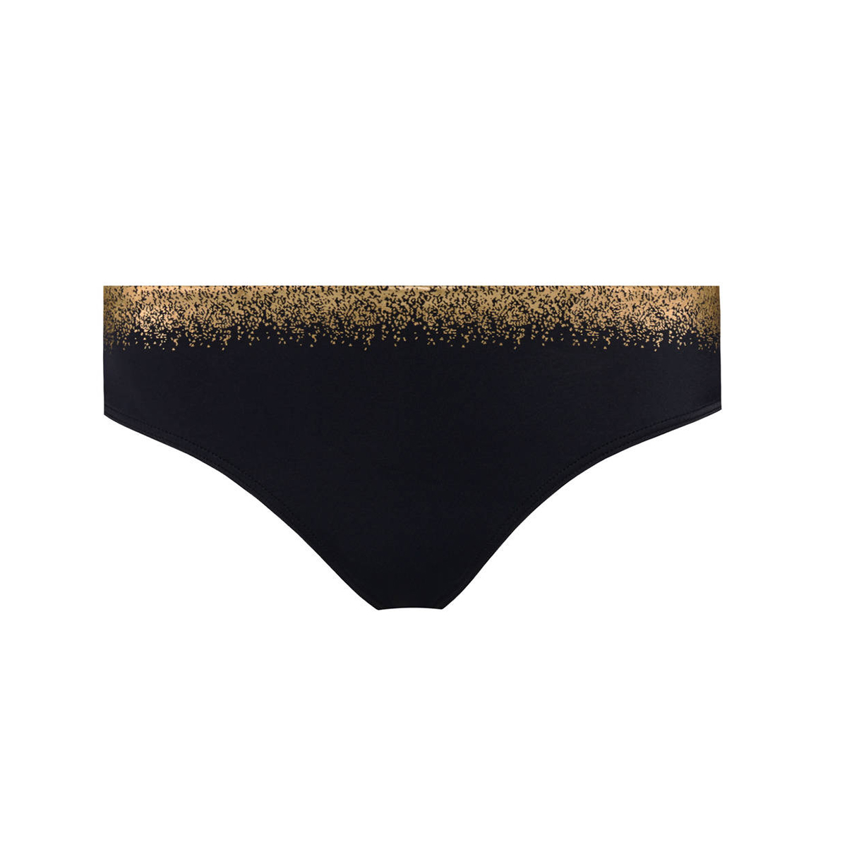 Труси - бікіні із середньо-заниженою посадкою. Повністю виконані з мікрофібри, яка швидко сохне, а золоте напилення має захист від пляжного впливу. Передня панель дубльована для запобігання прозорості. Задня панель в області сідниць досить відкрита.