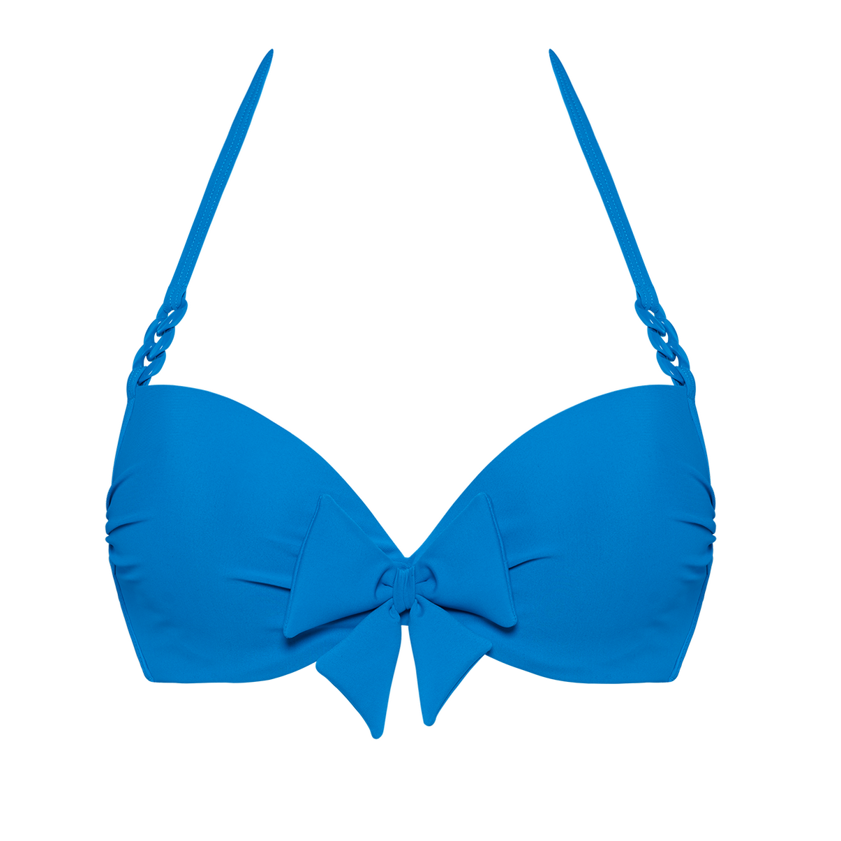 Бюстгальтер пуш ап із щільною чашкою та дуже глибоким та відвертим вирізом. Завдяки близько розташованим один до одного чашкам, бюстгальтер зробить Ваше декольте чарівним. Регульовані бретелі, прикрашені ланцюжками в основі. Бант наповнений спеціальним мусом, щоб зберігати форму після купання. Комфортна та сексуальна модель