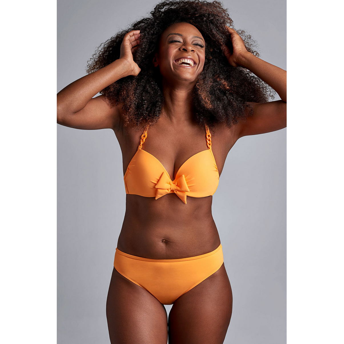 "Виконайте фурор у моїй жіночній колекції Papillon, яка представлена в двох яскравих кольорах. Грайливий дизайн забезпечить відмінну посадку для будь-якої фігури. І які ж прекрасні бретелі, доповнені кільцями! Але справжня "приманка" для очей, звичайно ж, це казковий бант, який прикрашає центр Вашого декольте. Trop minon!(Занадто мило!) Носіть мою колекцію Papillon і наважтеся засліплювати!"