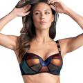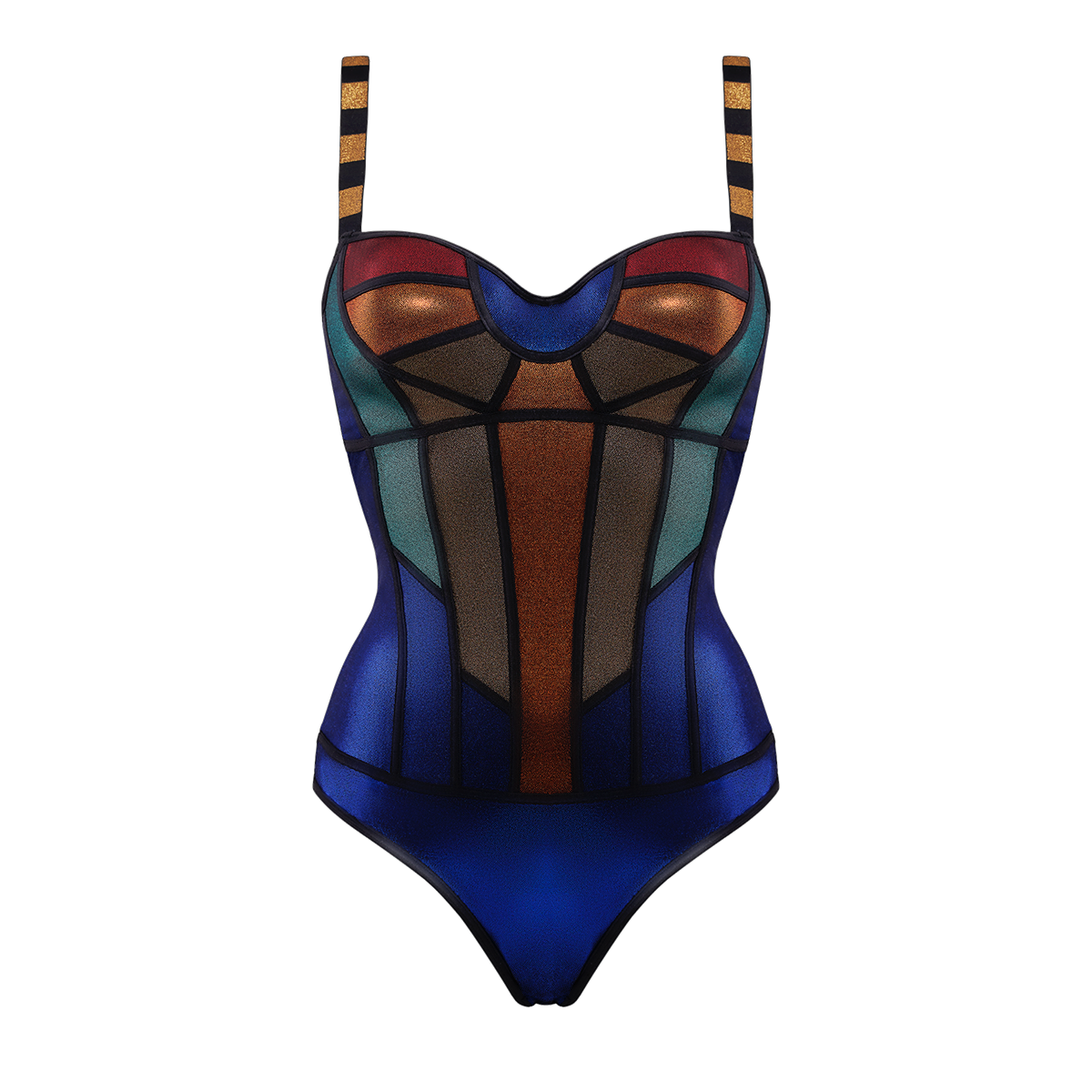 Боді з ущільненою формою чашок з інтегрованими подушками. На кісточках. Чашки та передня панель боді виконані у вигляді різнокольорового панно з металевим відблиском. Регульовані бретелі. Застібка між ніг. Задня панель – з непрозорої мікрофібри.