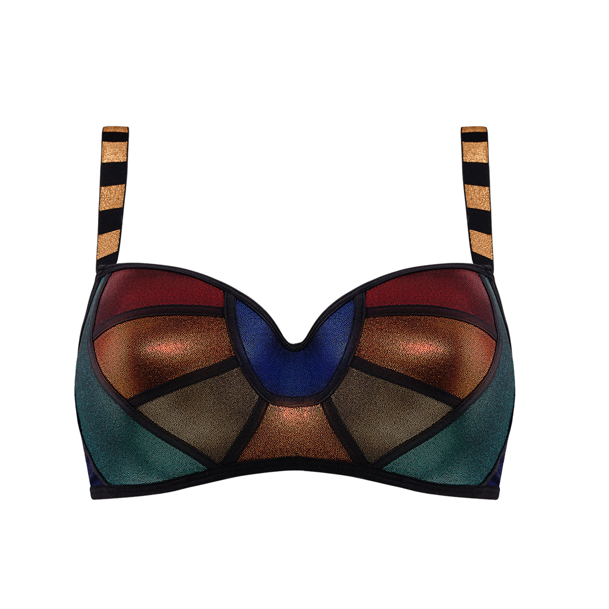 Бюстгальтер-балконет із ущільненою формою чашок з інтегрованими подушками. На кісточках. Чашки бюстгальтера виконані у вигляді різнокольорового панно з металевим відблиском. Задня панель – з непрозорої мікрофібри. Регульовані бретелі.