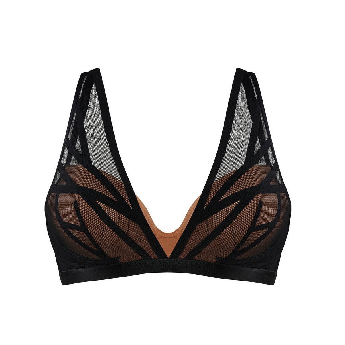 Бюстгальтер - пуш ап c з прошарком з мусу. Чашки виконані з бежевого мусу та покриті контрастною чорною сіткою з графічним орнаментом, яка плавно перетікає в бретелі, а потім і на спинку. Під сіткою заховані бретелі, що регулюються.