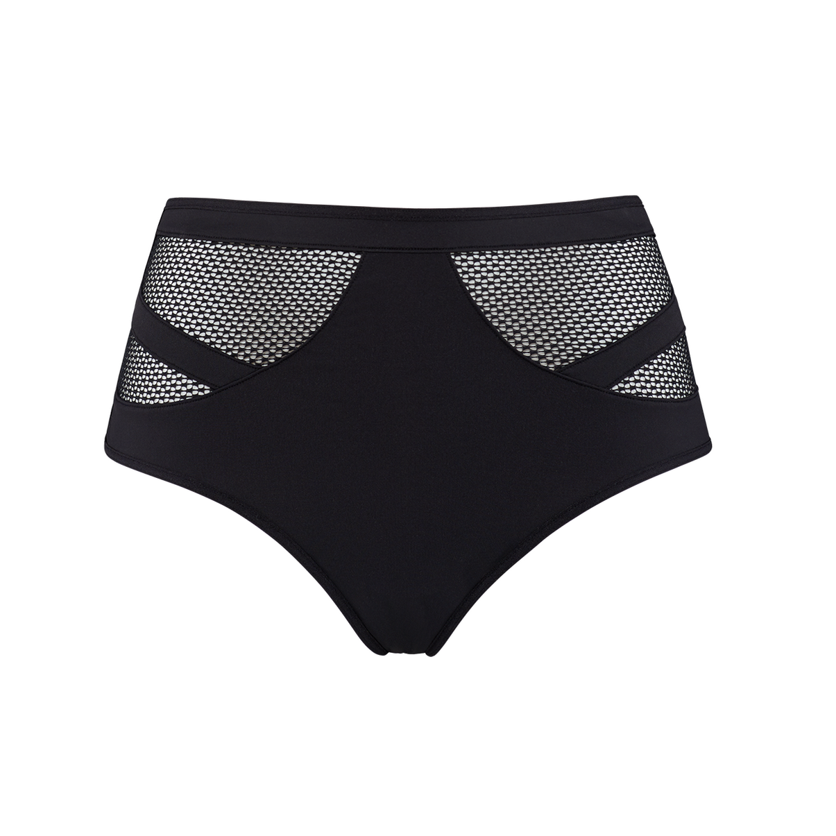 Труси-кюлоти з високою талією. Майже повністю виконані з мікрофібри. У верхній частині трусики декоровані сіткою зі смужками.