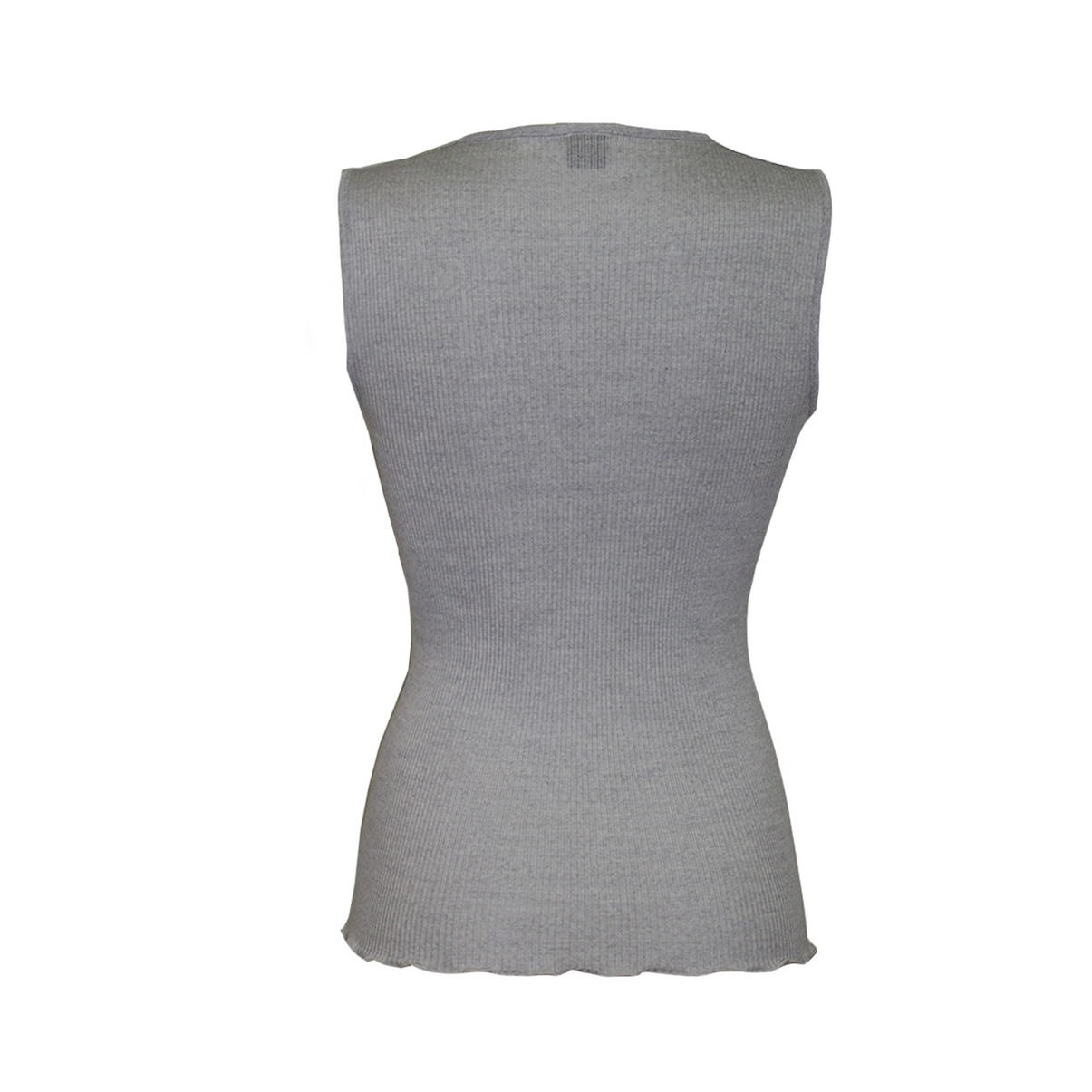 Топ без рукавів, виконаний з м'якого, безшовного трикотажного полотна. Передня панель виробу прикрашена квітковим орнаментом із макраме. Низ виробу – м'який волан (оверлок).