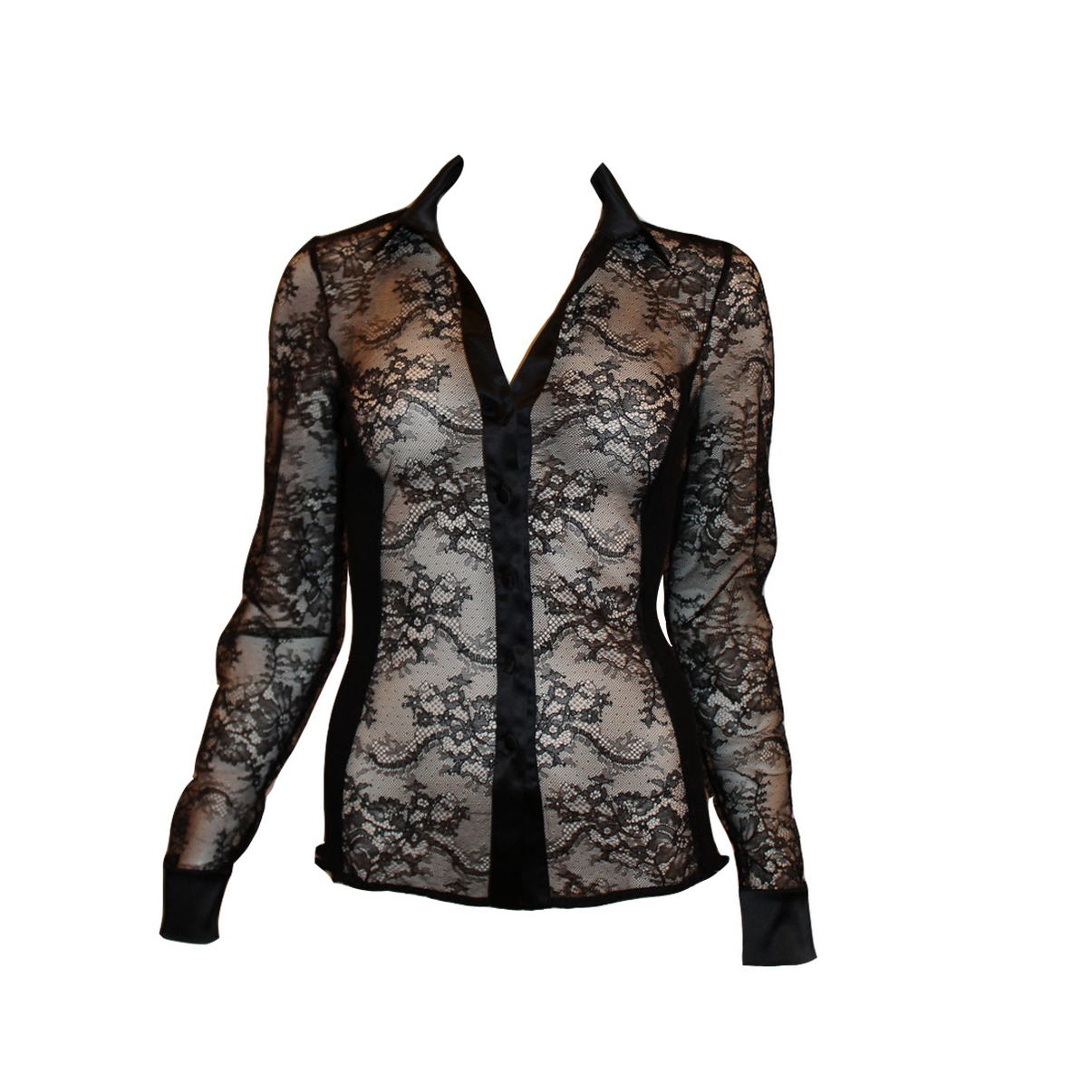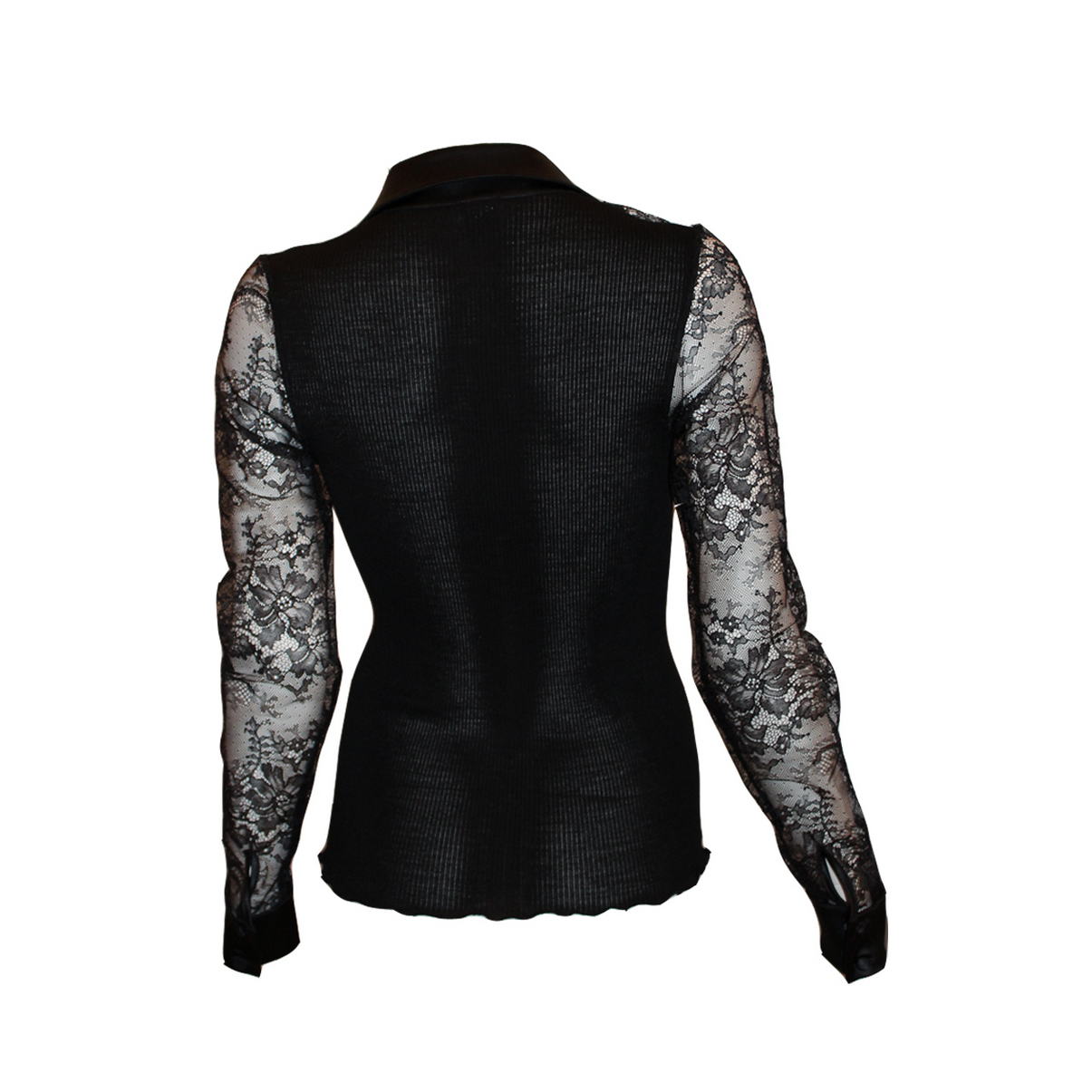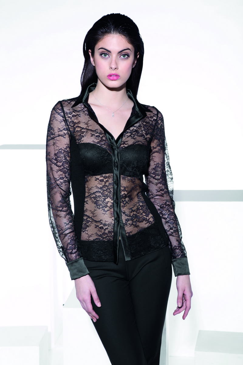 Кофта-сорочка з довгим рукавом на шовкових ґудзичках. Спинка – рельєфне трикотажне полотно. Комір, планка та манжети з шовкового атласу. Рукави та передні панелі - французьке мереживо "Calais" (Кале) в тон виробу.