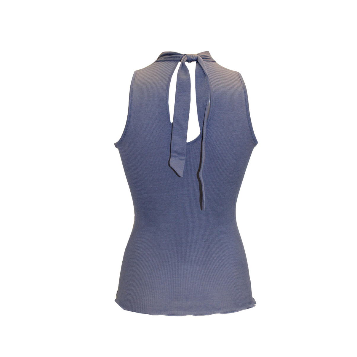Топ без рукавів, комірець "стійка". По спинці – виріз краплеподібної форми та застібка у вигляді трикотажних стрічок, які зав'язуються на бант. Передня панель виробу декорована кольоровим гіпюром геометричної форми.