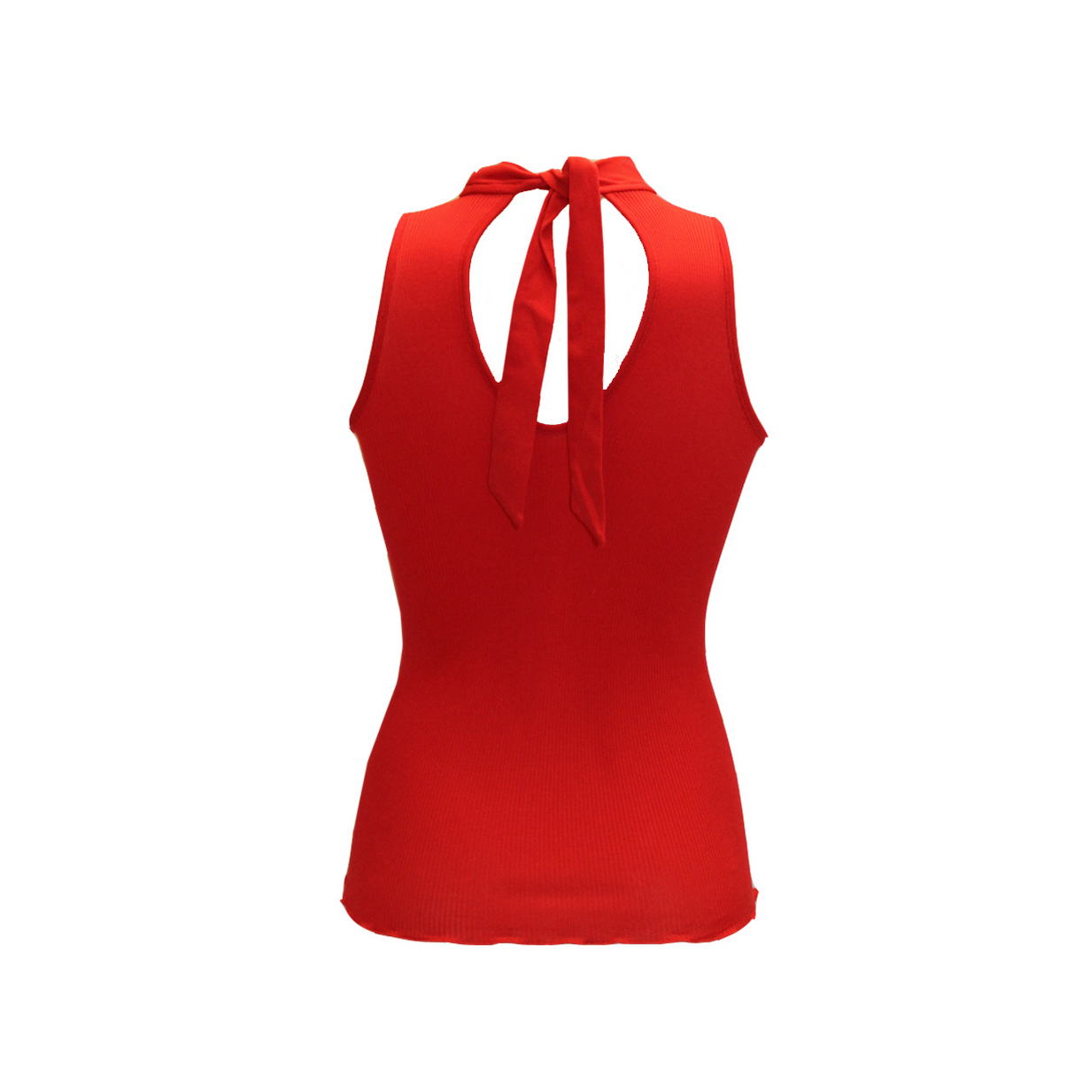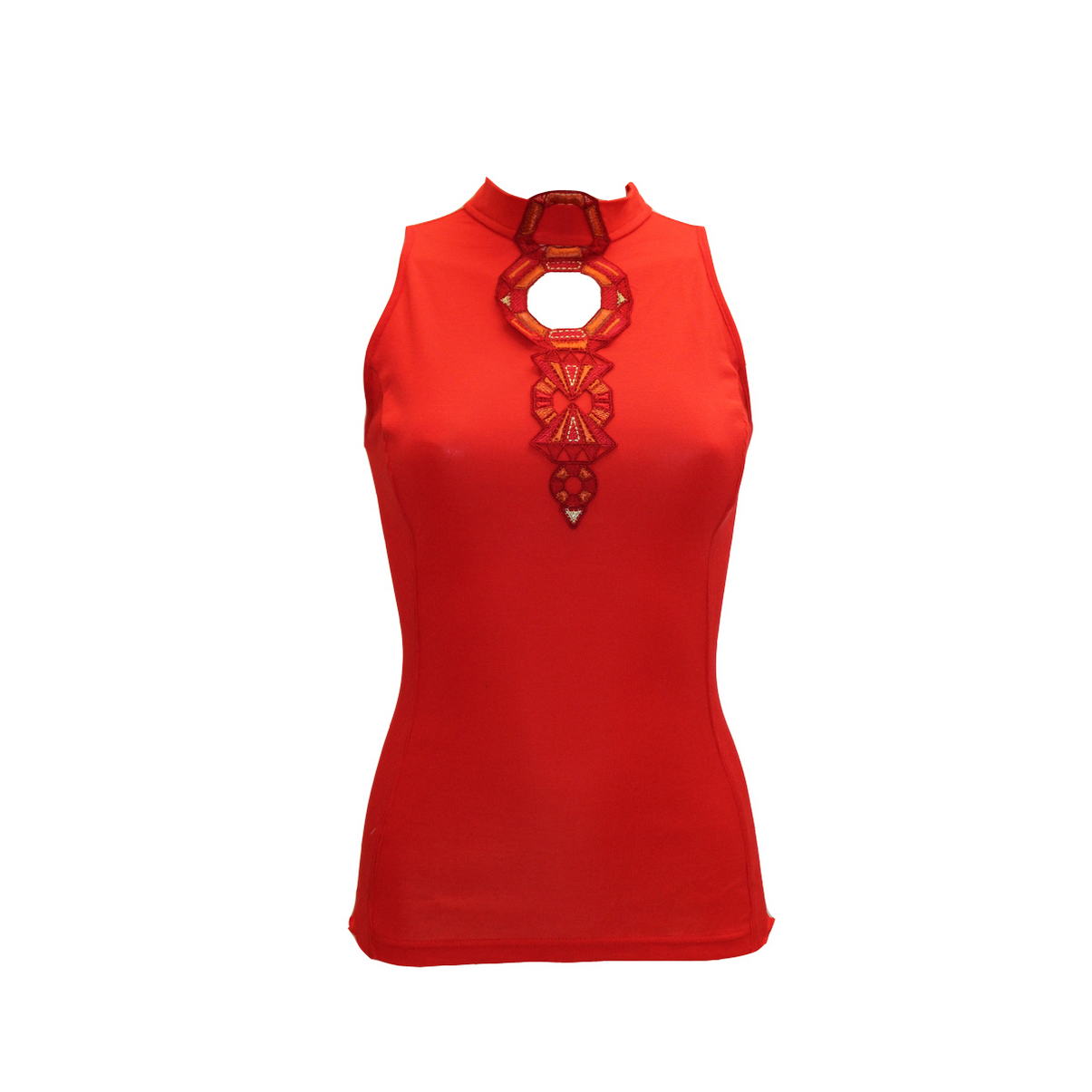 Топ без рукавів, комірець "стійка". По спинці – виріз краплеподібної форми та застібка у вигляді трикотажних стрічок, які зав'язуються на бант. Передня панель виробу декорована кольоровим гіпюром геометричної форми.