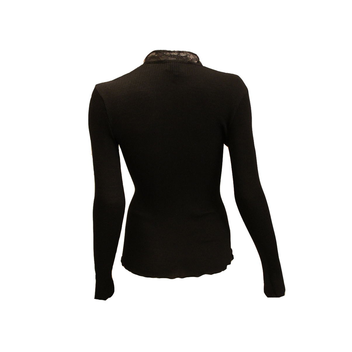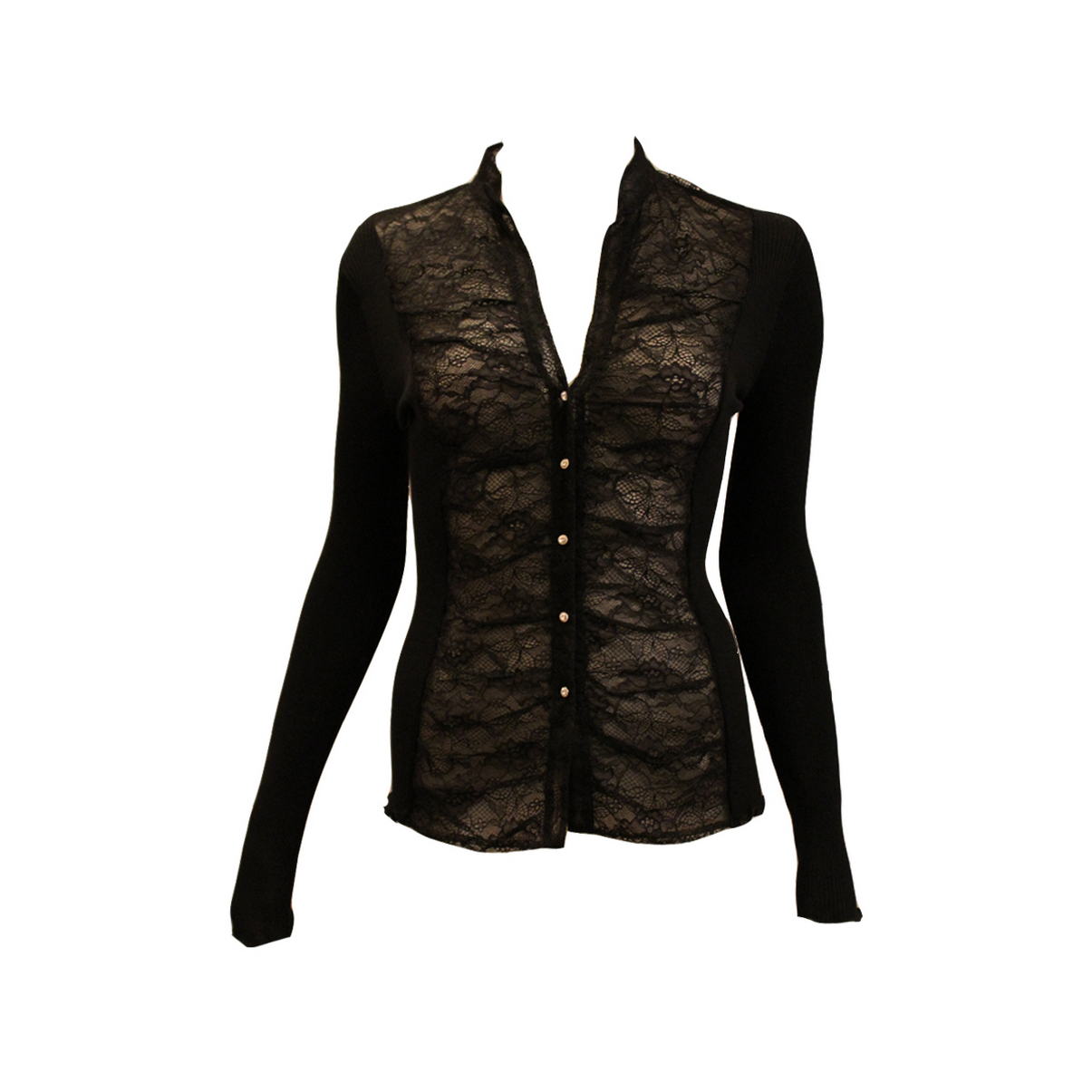 Кофта з довгим рукавом. Передня панель виготовлена з мереживного полотна, яке дублюється м'яким тюлем. Комір – мереживна стійка. Застібка на маленьких ґудзиках, декорованих блискучими кристалами. Низ виробу та рукава - оверлок.