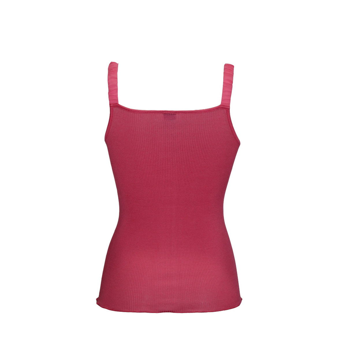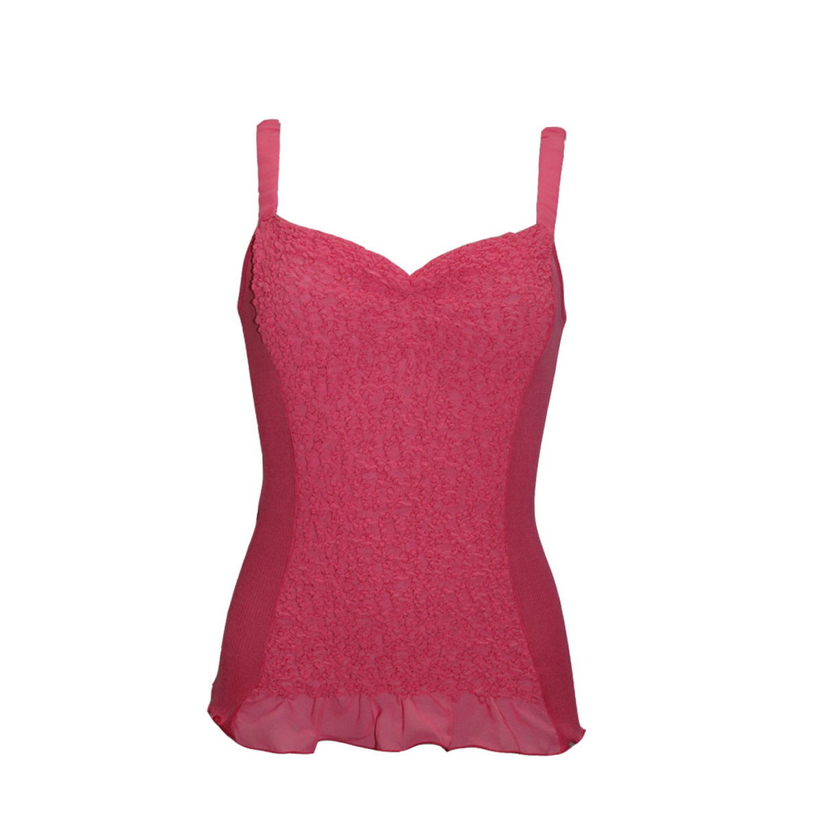 Майка на вузьких бретелях, які прикрашені легким шифоном. Спинка із рельєфного трикотажного полотна. Передня панель – стиснутий шифон з легкими "зборками" в області декольте. Низ виробу – м'який волан.