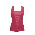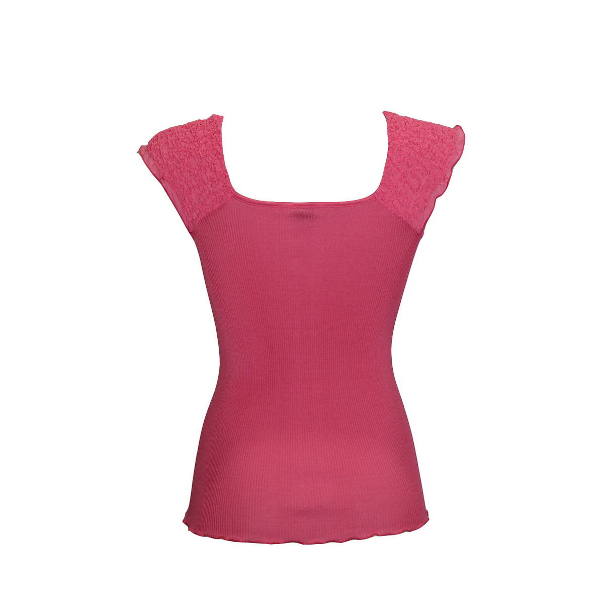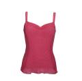 Майка - топ, бретелі якої дозволяють оголити плечі. Спинка із рельєфного трикотажного полотна. Передня панель – стиснутий шифон з легкими "зборками" в області декольте. Низ виробу – м'який волан.
