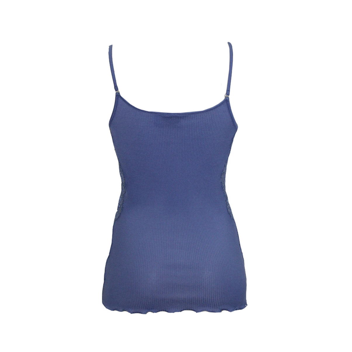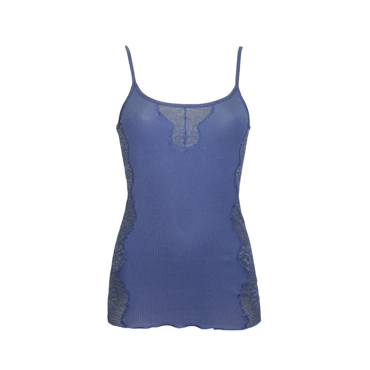 Майка на тонких бретелях із трикотажного полотна. Бічні вставки та декольте виконані з мережива. Низ виробу – м'який волан (оверлок).