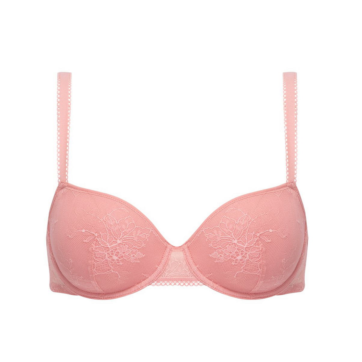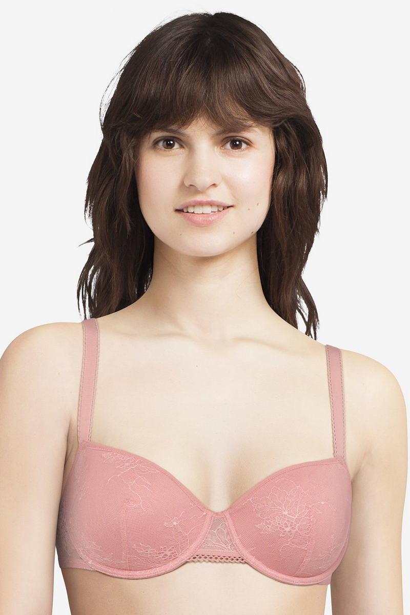 Бюстгальтер з формованою чашкою - спейсер - ("дихає") на кісточках, виконаний з 3D-матеріалу нового покоління, який характеризується легкістю та повітропроникністю. Дозволяє дихати та швидко відводити непотрібну вологу. Чашки покриті мереживом з квітковим орнаментом. Центральна та задня панелі виконані з мережива. Регульовані бретелі.