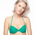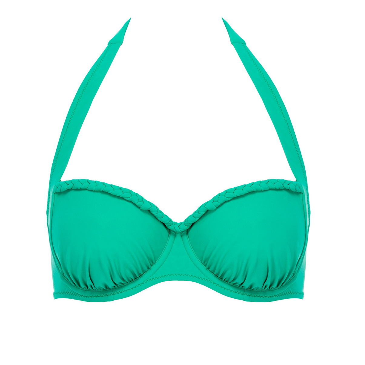 Бюстгальтер з м'якою балконованою формою чашок на кісточках. Ціліснокрійні бретелі зав'язуються навколо шиї. Область декольте декорована косичкою.