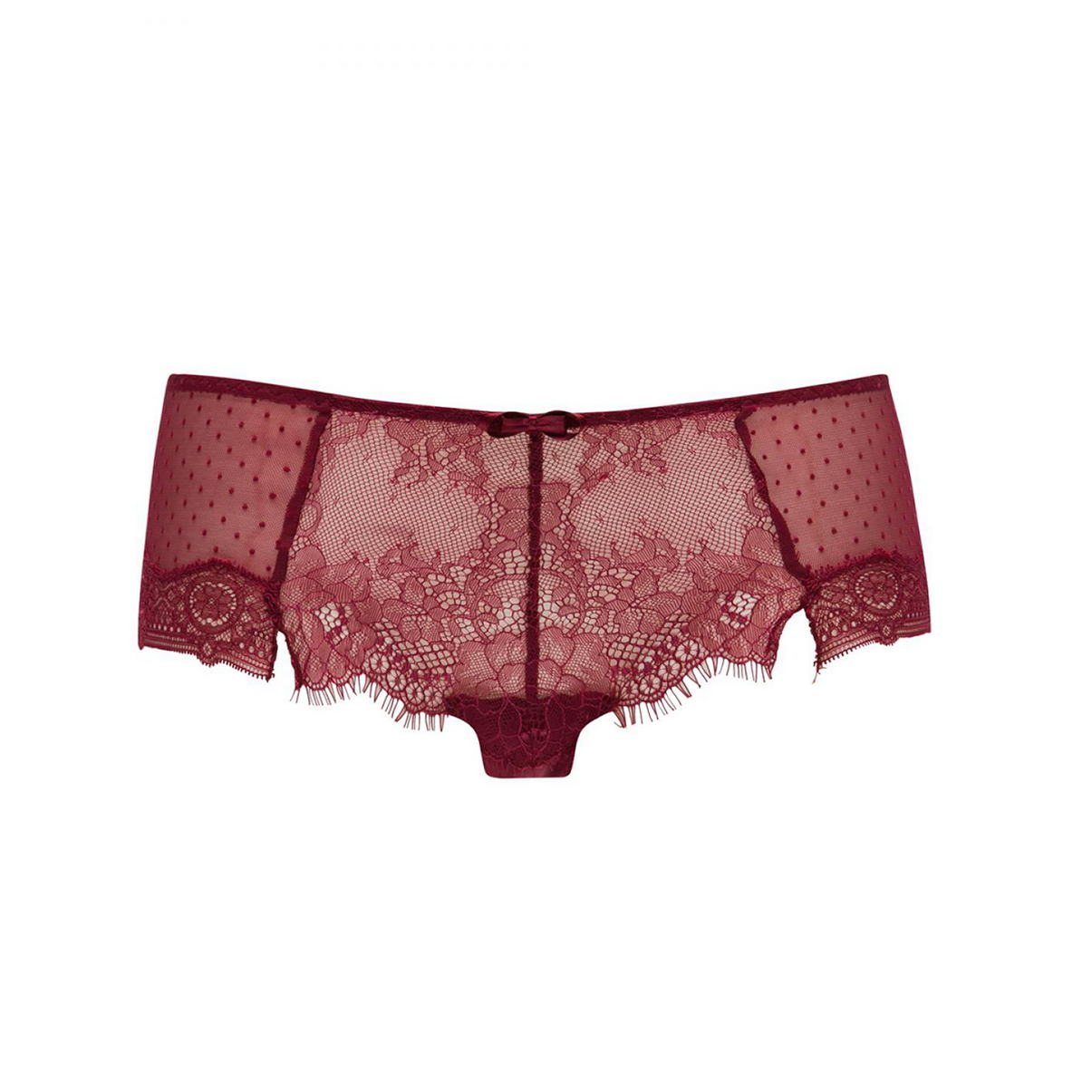 Труси-боксери із середньо-заниженою посадкою повністю виконані з тюлю в горошок. Передня панель декорована квітковим мереживом. Нижній край боксерів декорований мереживною тасьмою.