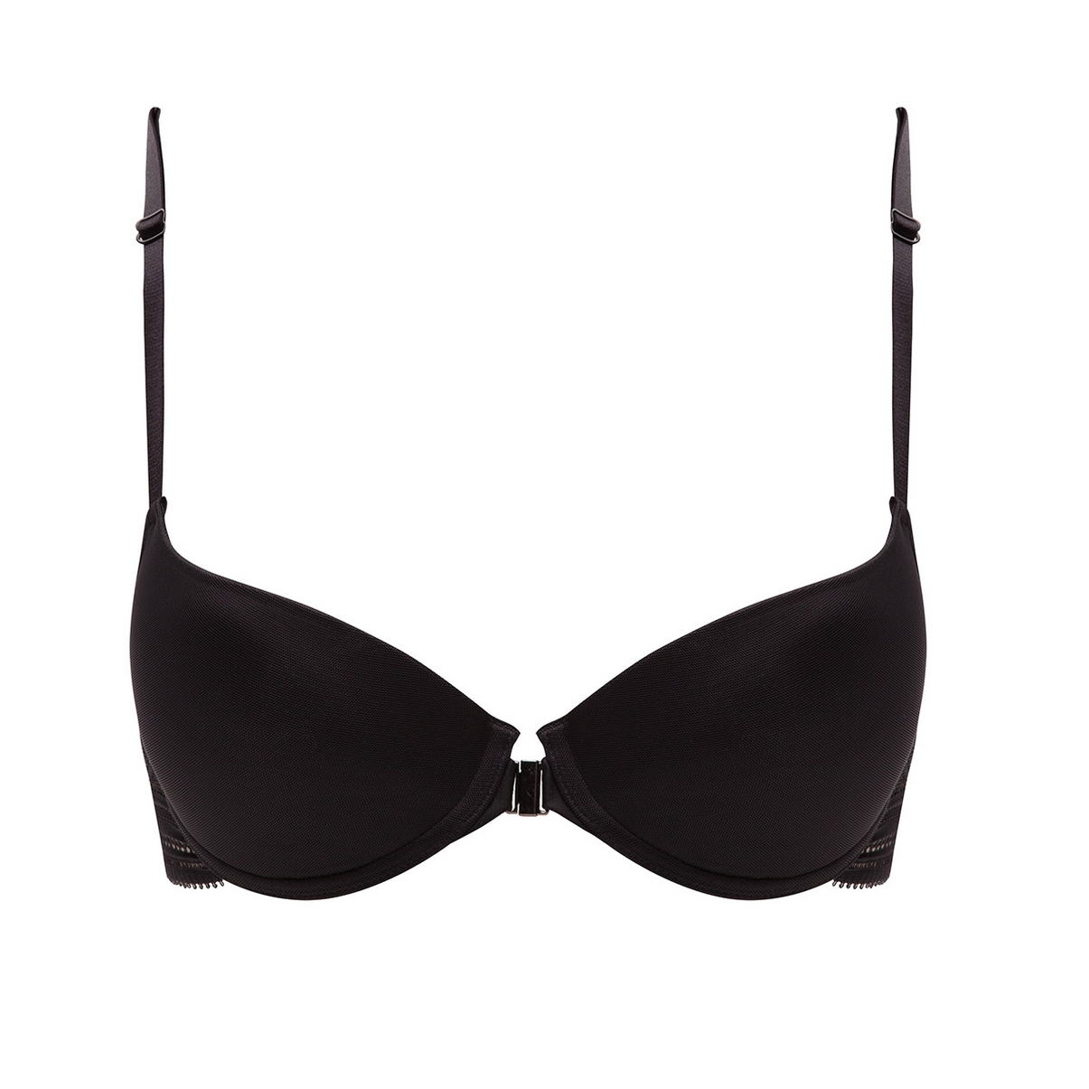 Бюстгальтер - пуш ап з ущільненою формою чашок з товстим прошарком з мусу* (*у чашці Е - шар мусу тонкий). На кісточках. Чашки покриті плоскою сіткою. Застібка на центральній панелі. Регулюючі бретелі. "Американська" спинка. Бічні панелі виконані з графічного мережива та декоровані тасьмою.