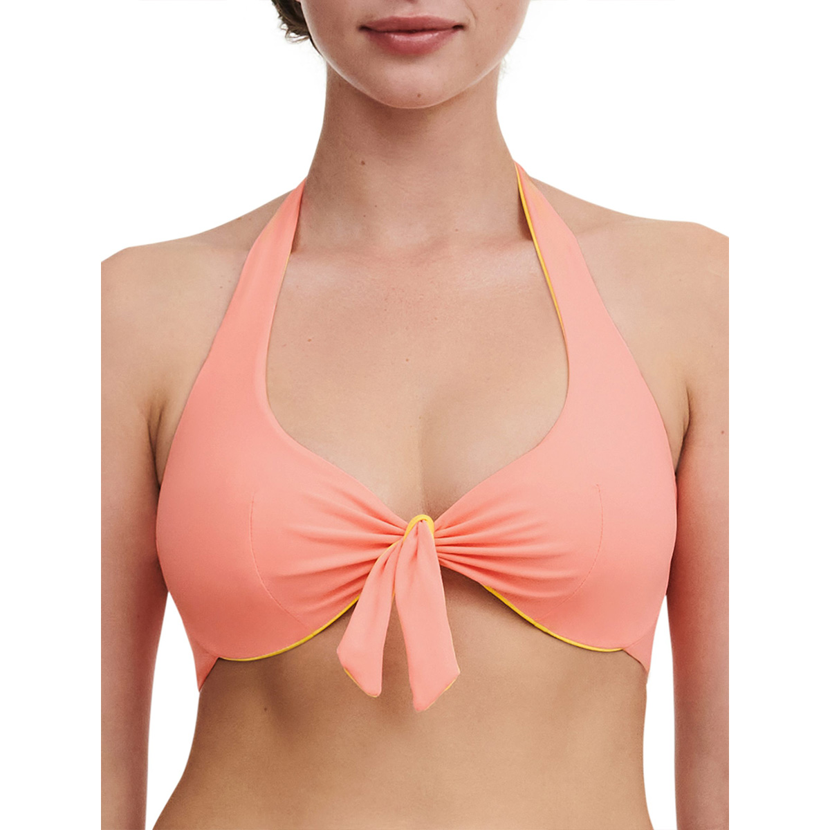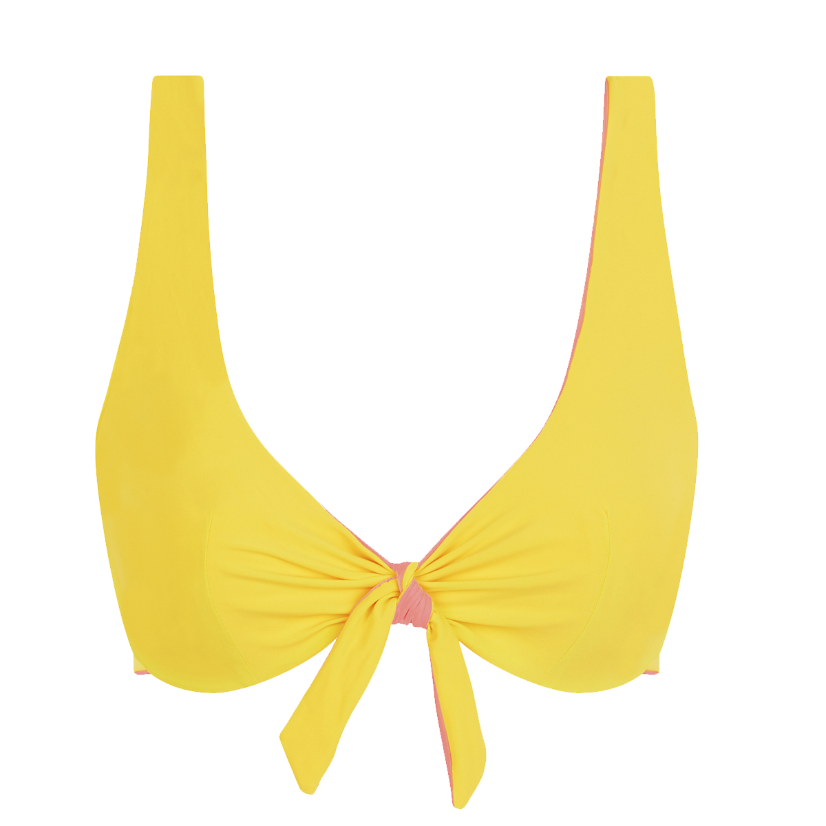 Бюстгальтер – класичний з м'якою формою чашок на кісточках. Бюстгальтер - трансформер: двосторонній - жовтий та помаранчевий. Бретели можна зав'язувати навколо шиї або класичний варіант через плечі. Задня панель – на зав'язках.