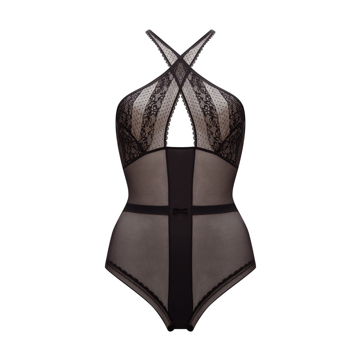 Боді з прозорого тюлю з ефектом пояса. З м'якою неординарною формою чашок, які виготовлені з мережива. Бретелі "схрестилися" на спині. Застібка між ніг.