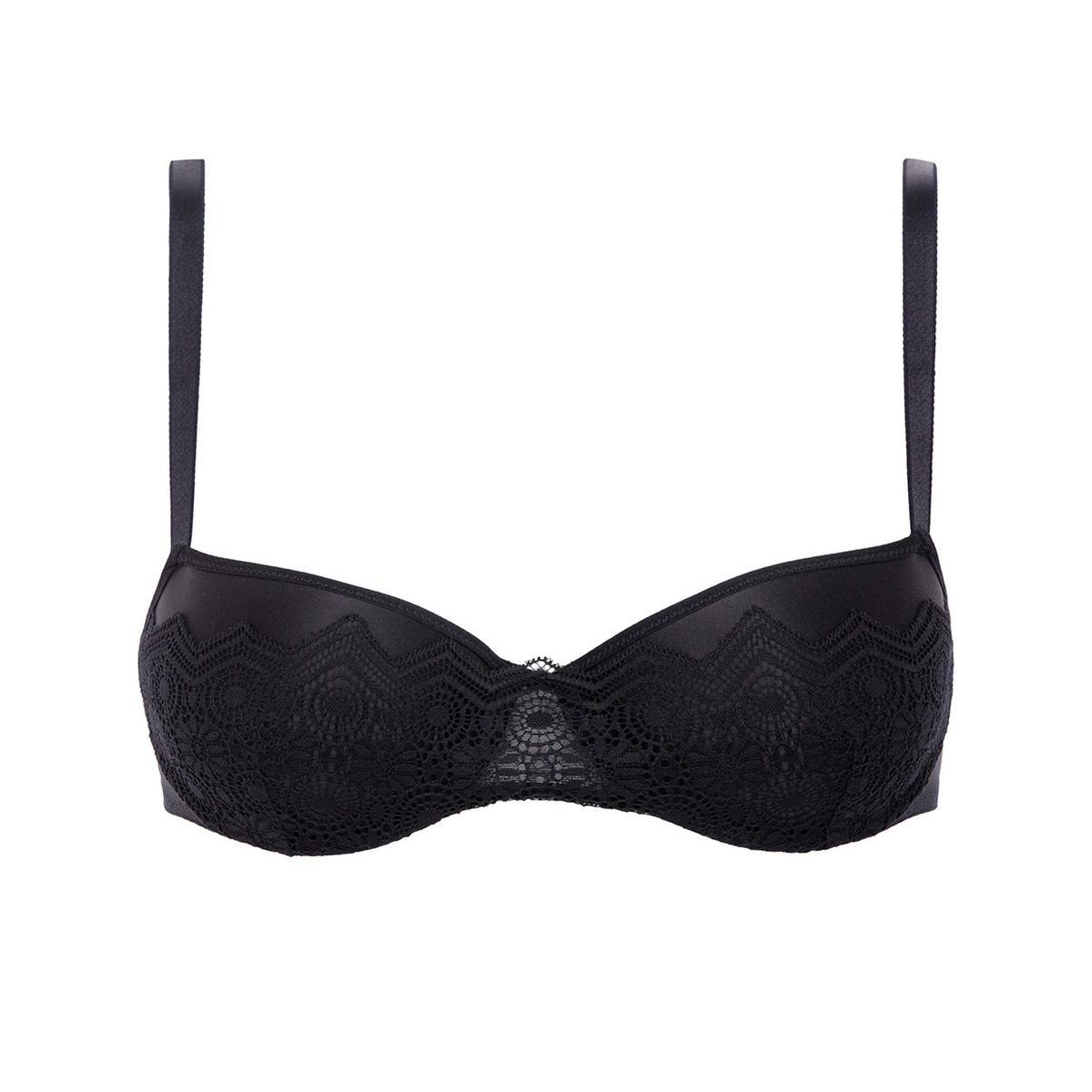 Бюстгальтер - пуш ап з ущільненою формою чашок з інтегрованими подушками. Чашки покриті графічним мереживом із контрастною обробкою. Регульовані бретелі.