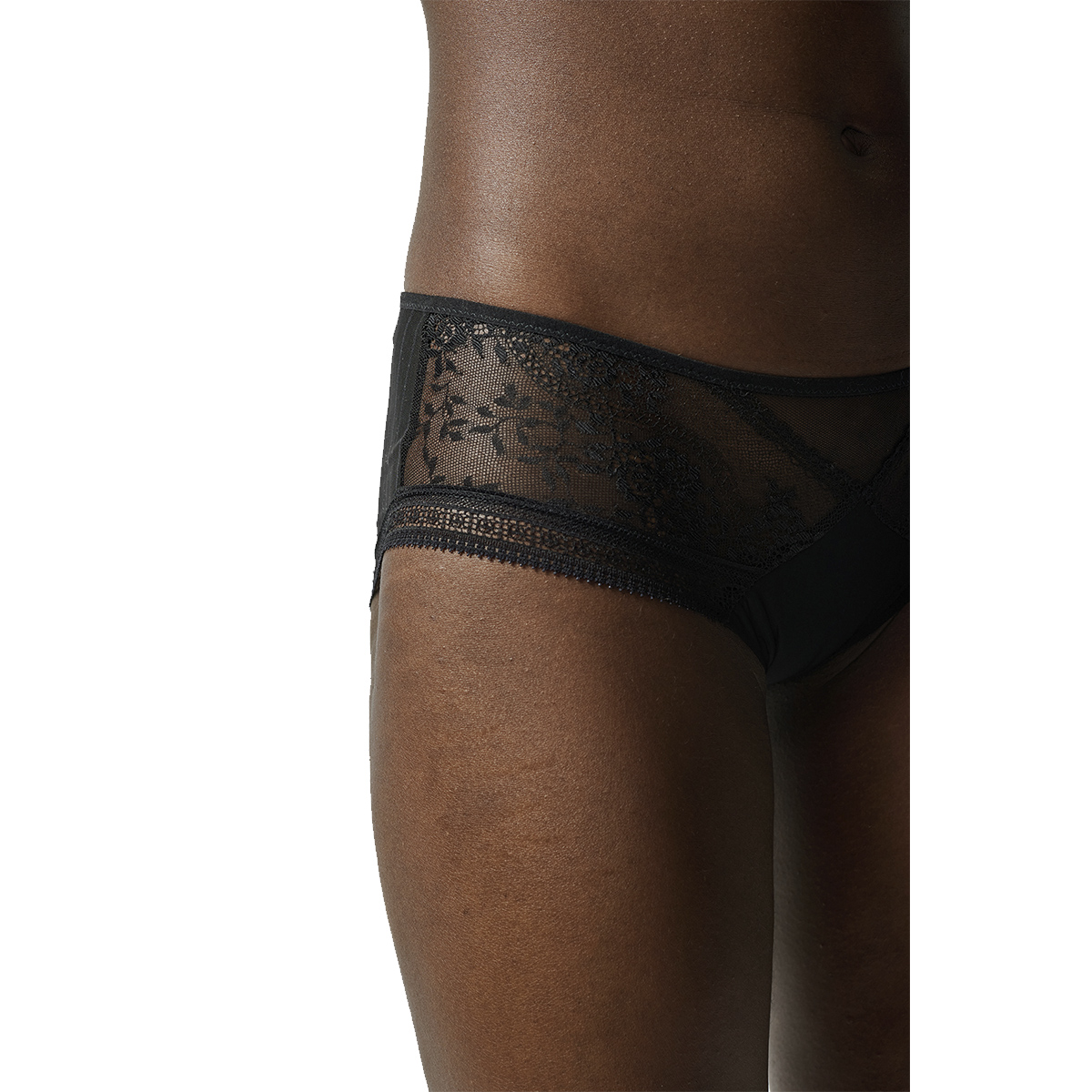 Труси – боксери із середньо-заниженою посадкою. Передня панель виконана з мережива з квітковим орнаментом, доповнена вставкою з тюлю та декоративною тасьмою; задня – з тюлю в смужку.