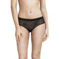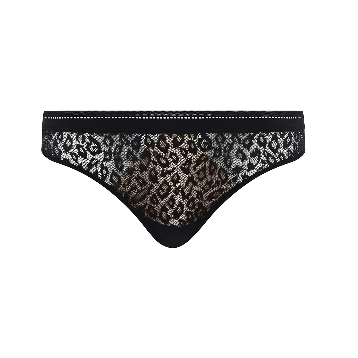 Труси - стрінги із заниженою посадкою. Повністю виготовлені з прозорого мережива з візерунком леопарда. Передня панель дубльована для запобігання прозорості. Верхній край - для контрастного ефекту доповнений непрозорою тасьмою з мікрофібри.