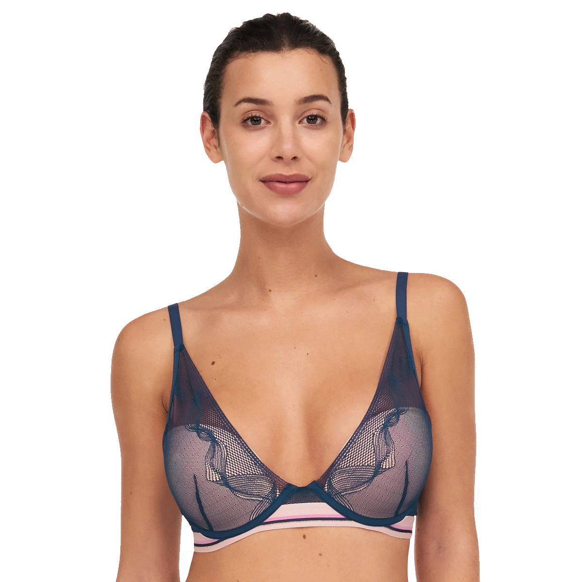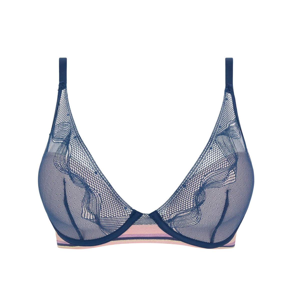 Бюстгальтер із злегка ущільненою формою чашок. Чашки вкриті мереживом. Основа бюстгальтера – широка еластична резинка у стилі спорт – шик. Задня панель – із сітки. Регульовані бретелі.